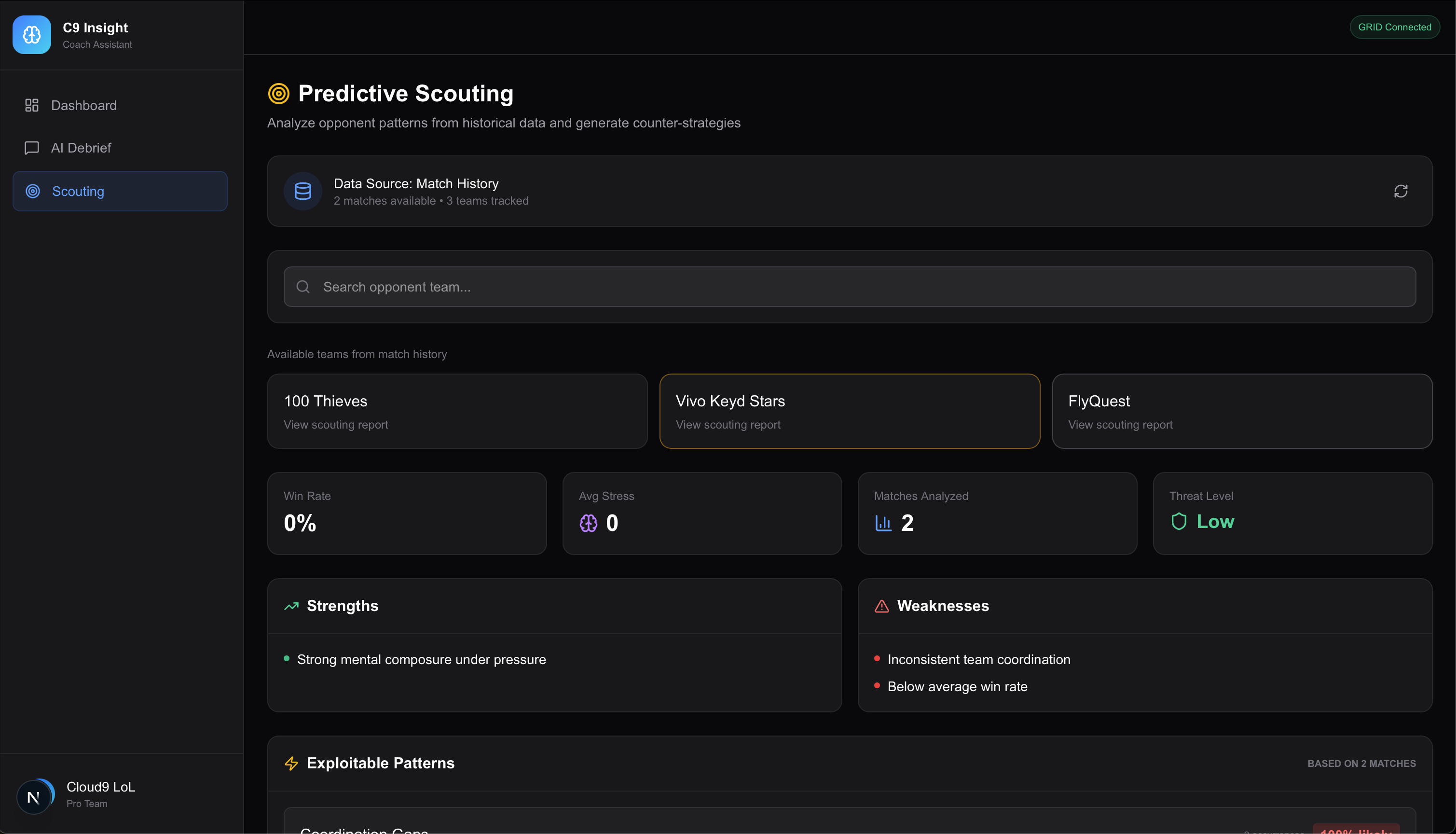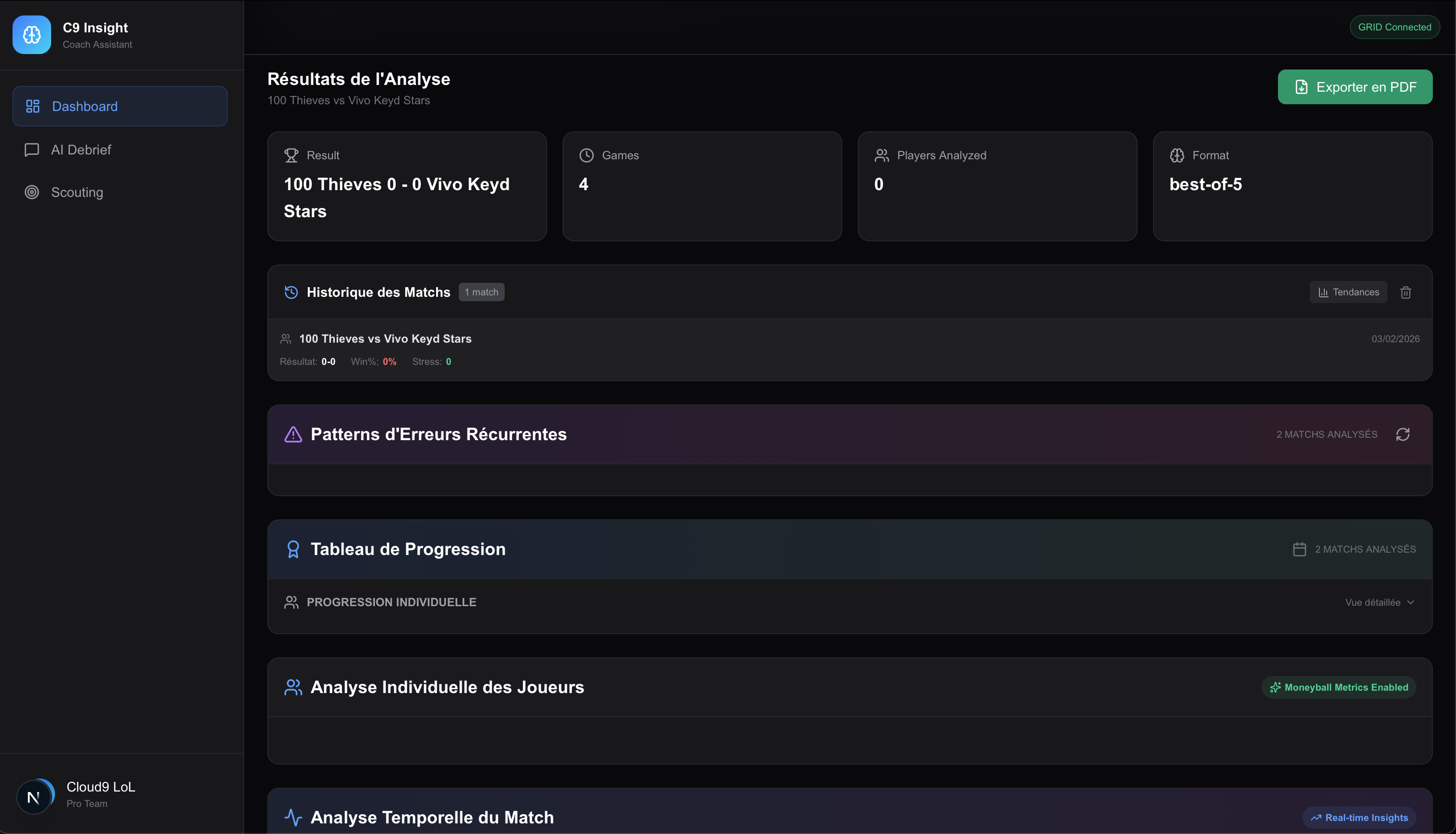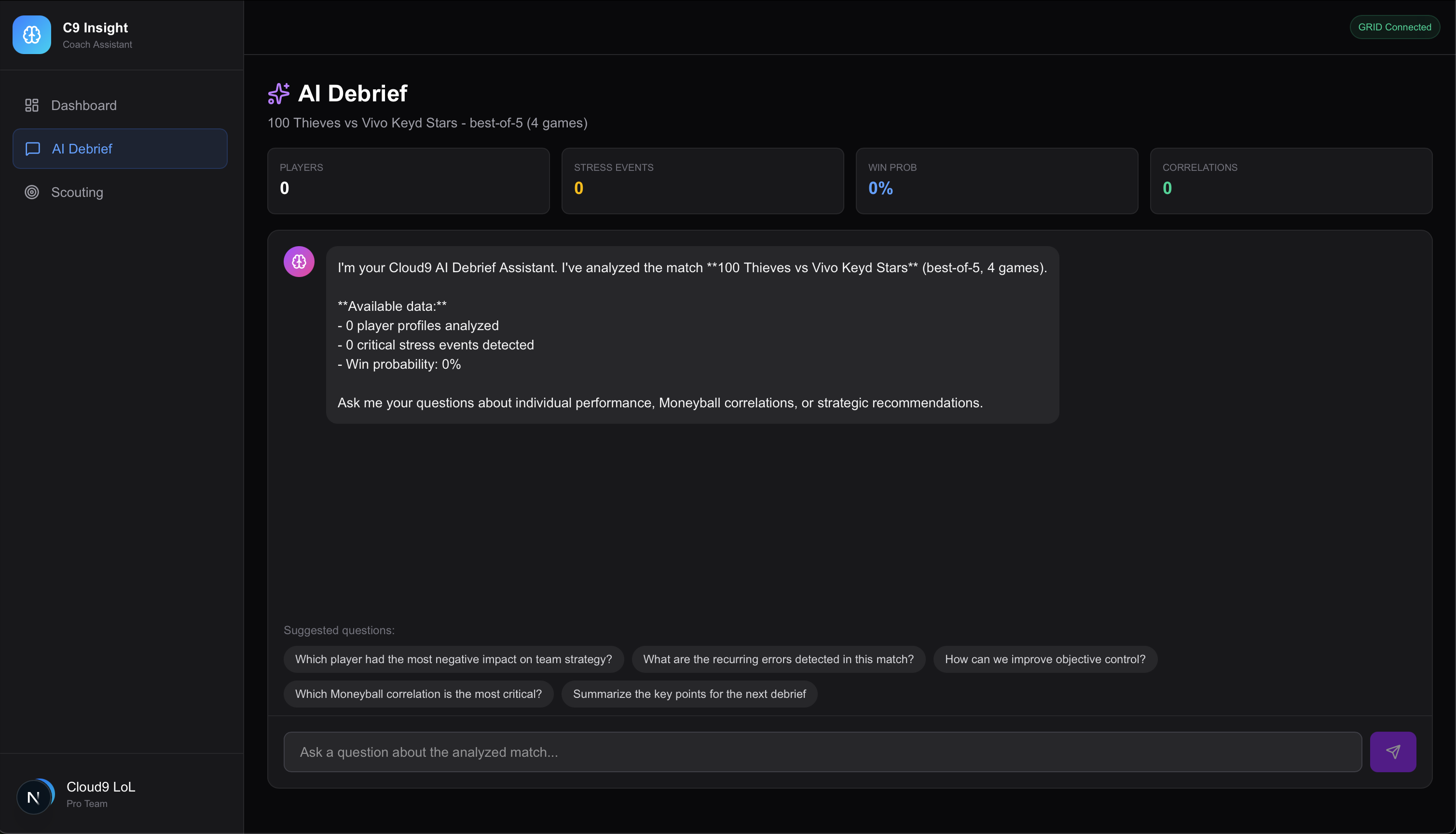 It analyzes official GRID data to: detect recurring individual player errors, measure their impact on the team's overall strategy, identify trends, weaknesses, and collective strengths, and generate actionable recommendations for coaches and players. The tool doesn't just display statistics; it analyzes the data to provide understandable and immediately actionable insights.