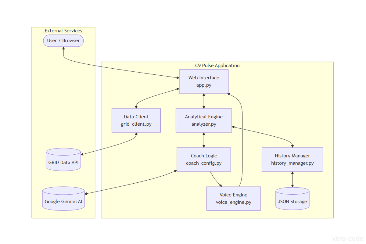 C9 Pulse is a comprehensive Assistant Coach (v0.4.0) powered by GRID's Live Data. It has evolved from a console script into a full Web Dashboard application with three core layers: