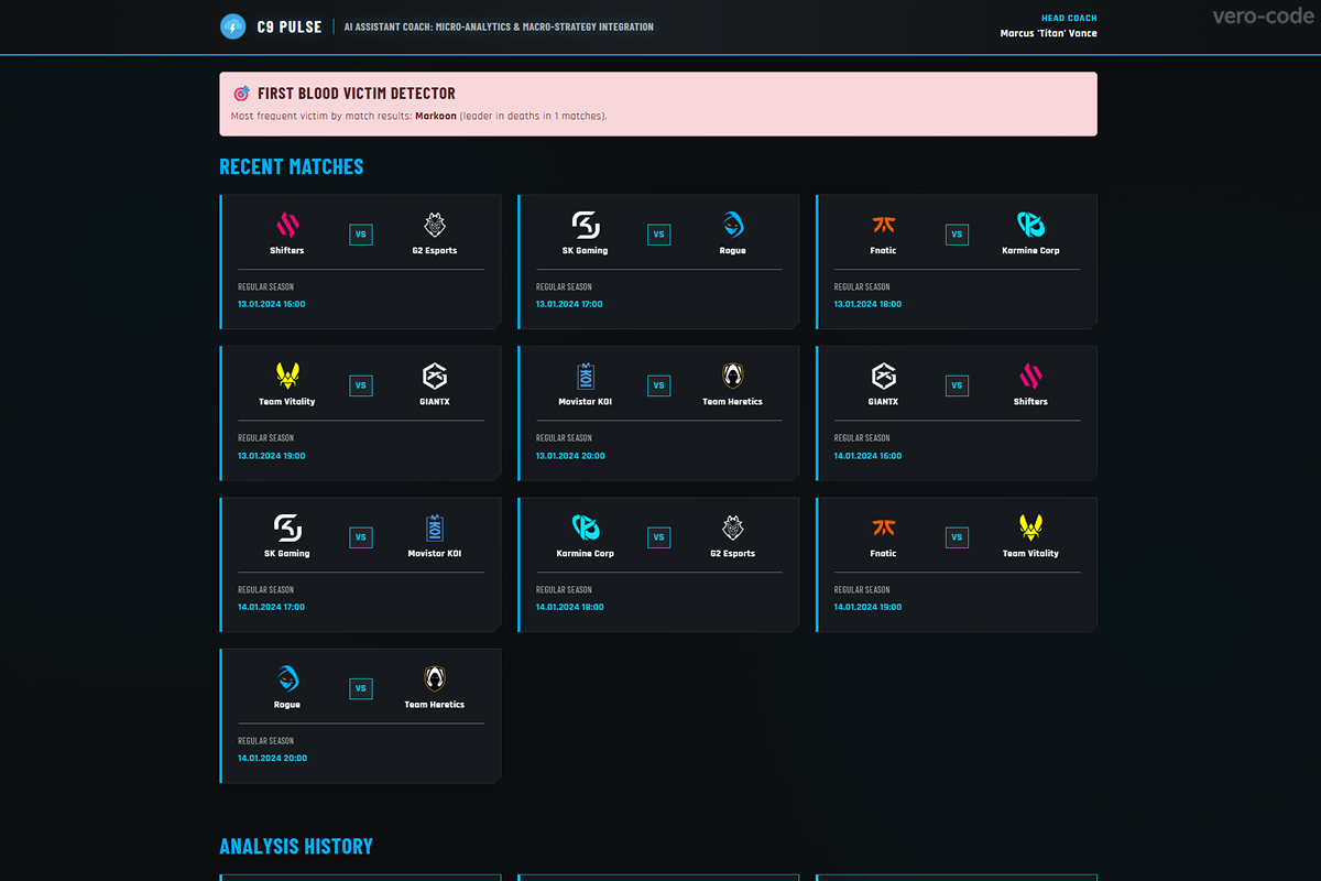 Command Center: Real-time GRID match feed featuring an automated "First Blood Victim" detector for instant pre-game scouting.