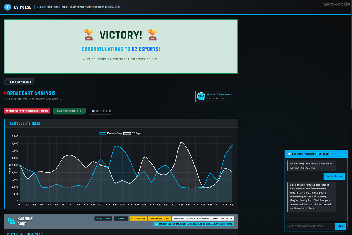 I created C9 Pulse — "Moneyball with a Heart." It is an intelligent engine that doesn't just show charts but acts as a psychological and strategic anchor. It is the Hype Man who celebrates your highs AND the Analyst who fixes your economy mistakes in real-time.