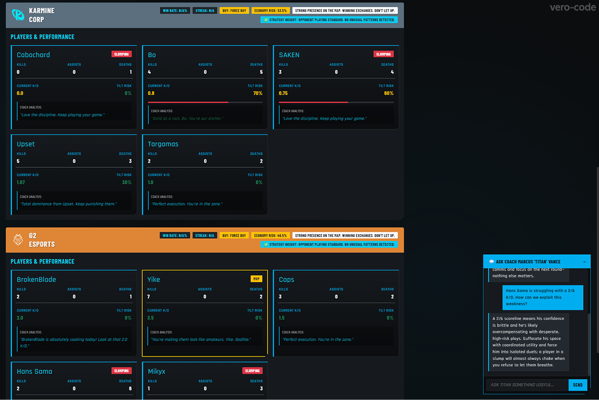 In the hackathon welcome video, the organizers asked for an assistant that acts like an enthusiastic human. In competitive esports (Valorant, LoL), success requires two things: Strategy and Mental Resilience. "Tilt" loses games just as much as bad aim, but playing without data loses rounds.