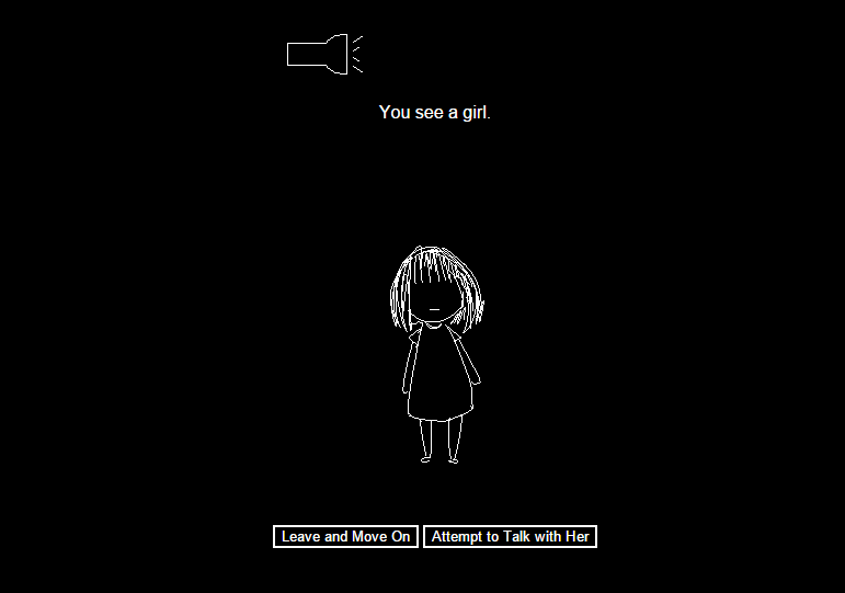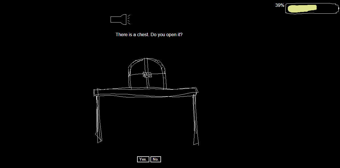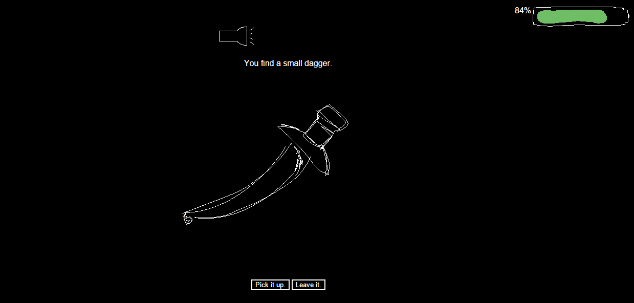 At the beginning, the user wakes up in an old cabin, not knowing how he or she arrived there. Attempting to escape, the user is faced with his/her current problem and is given 2 options, one that could harm them substantially and one that saves them (for now). The user attempts to escape through all the situations before the battery life, located in the upper right corner, is depleted. Once the battery life reaches 0, the game is over. The game is filled with twists that play with the user's decision making.