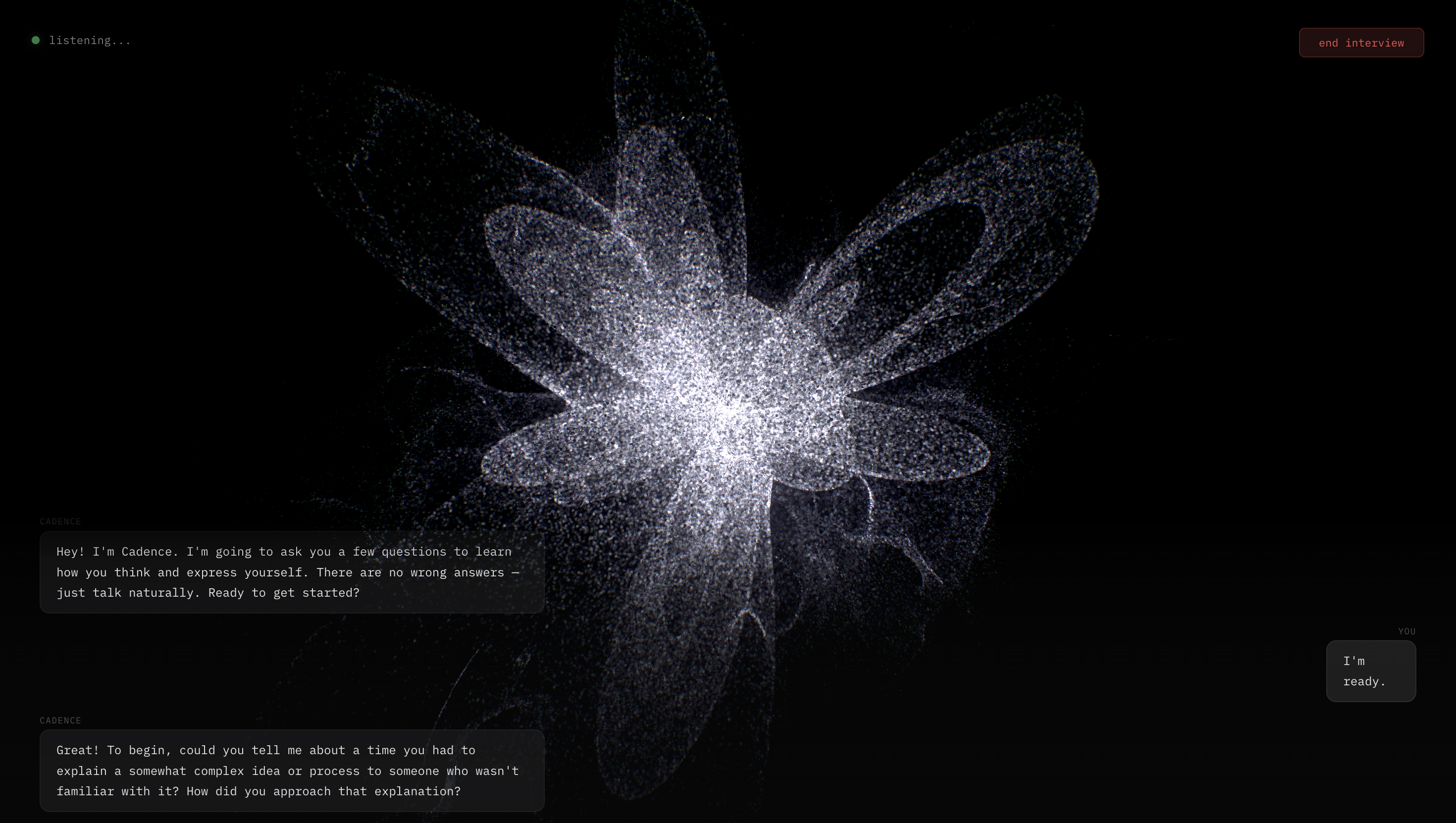 - live voice interview system with elevenlabs convai that adapts in real-time, paired with a three.js particle shader that pulses with the ai's speech. interview → transcript → fingerprint → usable voice profile in 5 minutes.