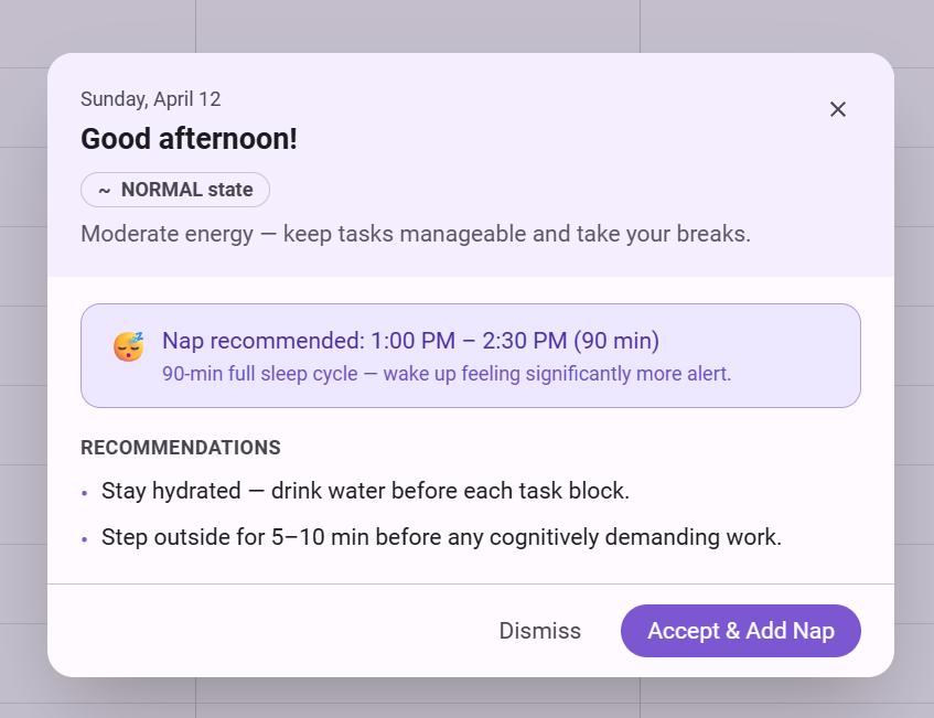 Instead of suggesting changes, the built-in Gemini agent acts on your behalf. You say "optimize today based on my sleep" and your calendar shifts on screen — hard tasks moved to your peak hours, breaks inserted automatically, purple exercise blocks deferred if your energy is low. Nothing is ever written back to Google Calendar, so your real calendar stays untouched.