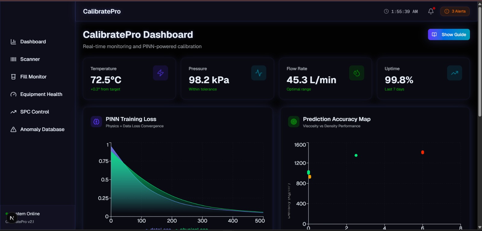 CalibratePro is a 7-layer accuracy defense system xombining ## UPC database and ##PINNs that guarantees 99.9% perfect fills. It replaces hours of manual calibration with a 10-second, physics-driven automated process.