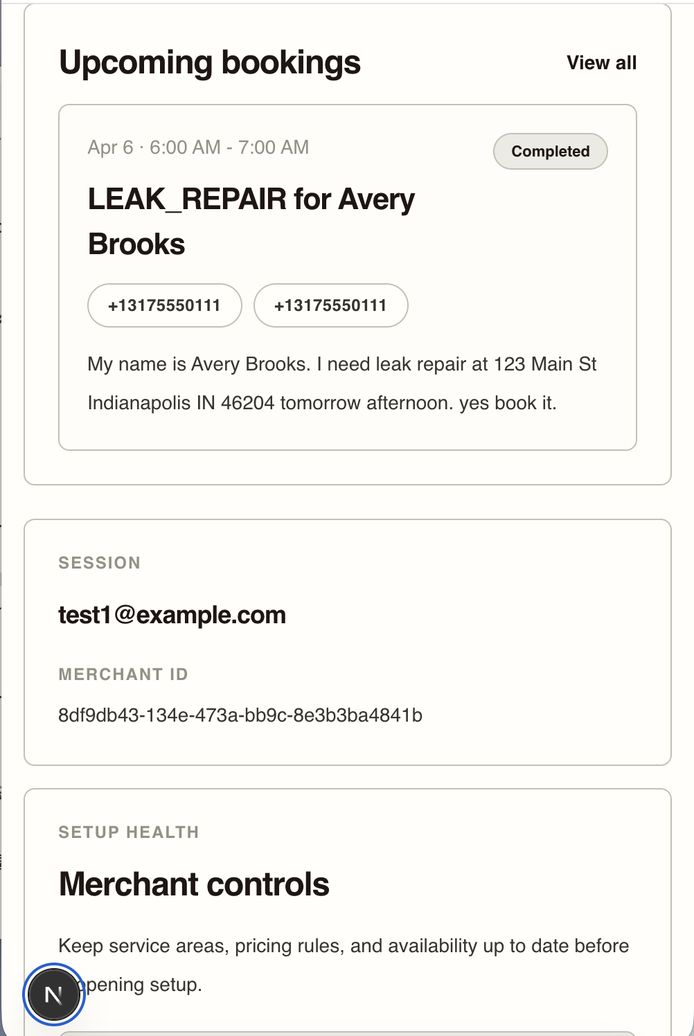 Next.js + TypeScriptfor app and API surface.Prisma + PostgreSQLfor merchant/call/booking/consent data.Auth.jsfor merchant authentication.- Domain modules for telephony, AI orchestration, extraction, pricing, availability, booking lifecycle, and compliance.