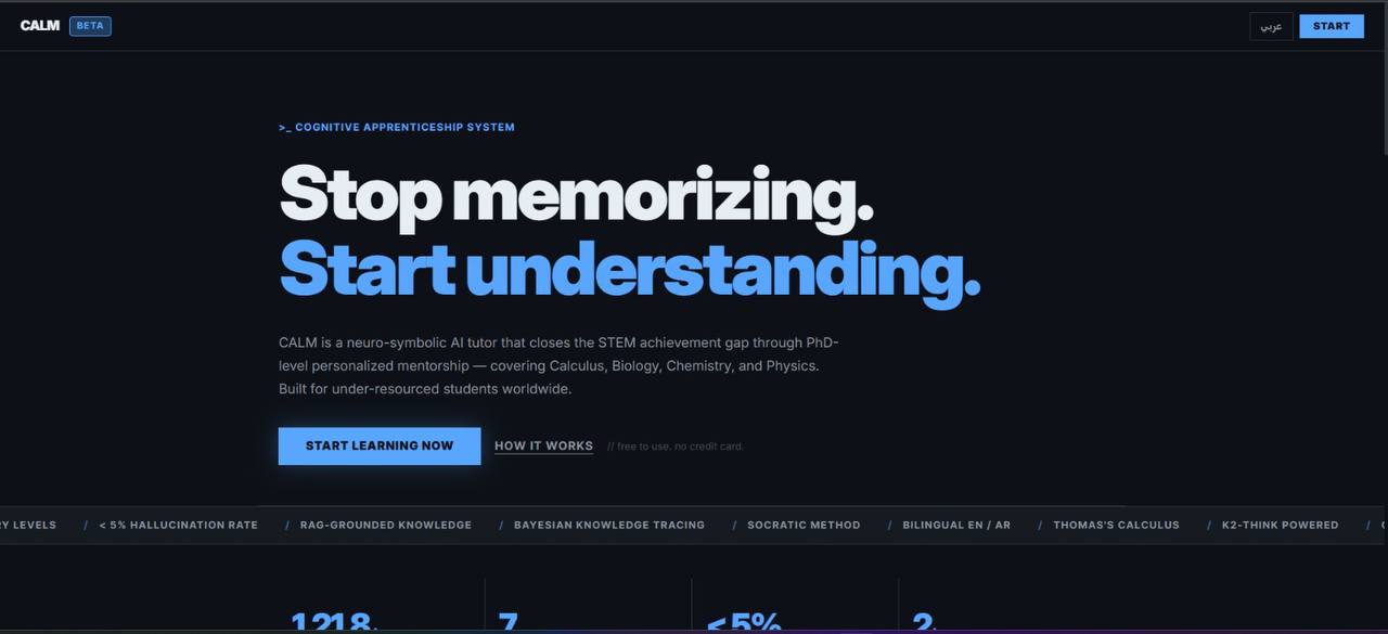 CALM was created to address this gap. Our goal is to provide a PhD-level AI mentor that guides students through reasoning rather than replacing their thinking. By combining modern AI models with structured learning principles, we aim to make world-class STEM education accessible anywhere, at zero cost.