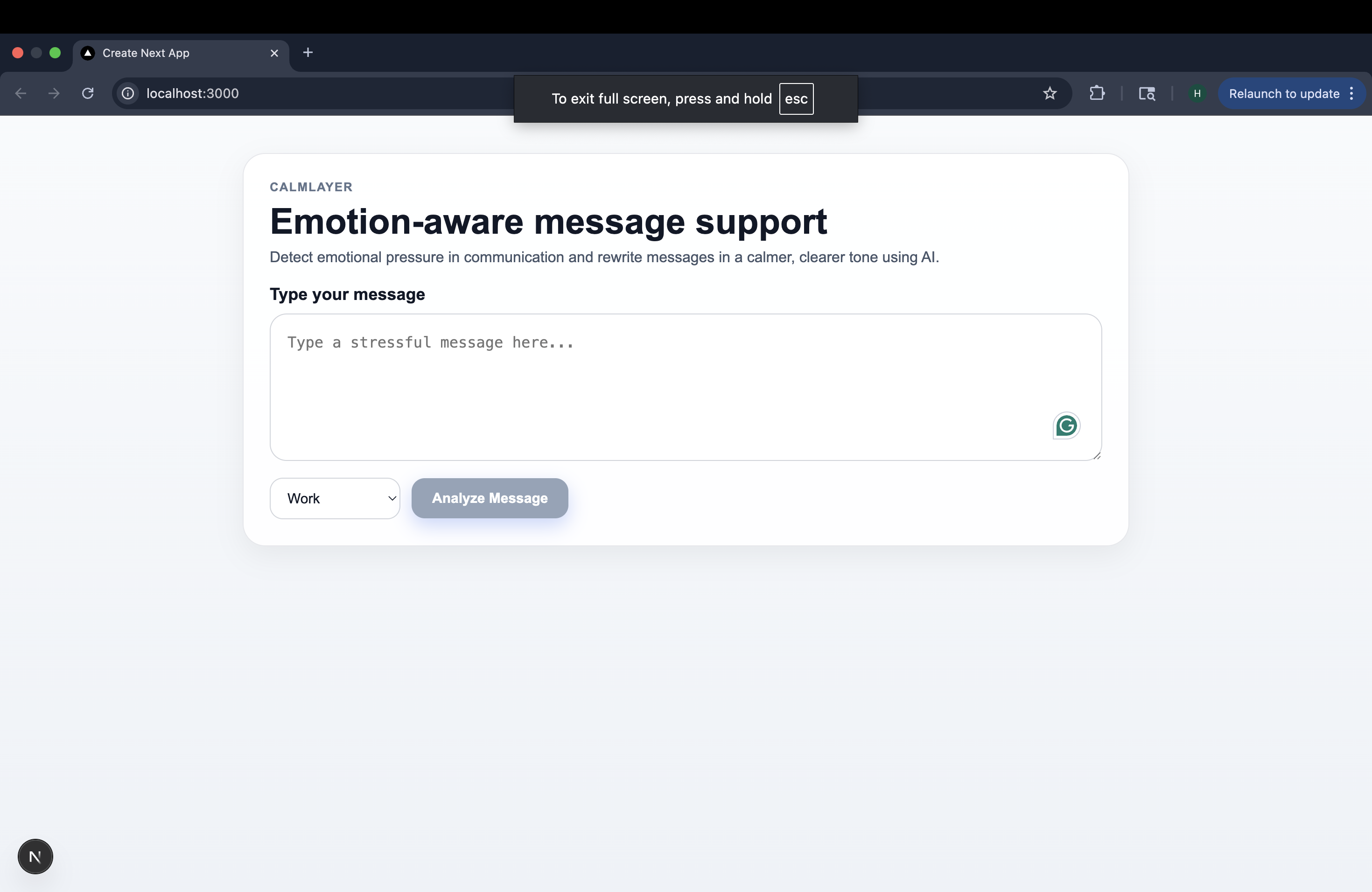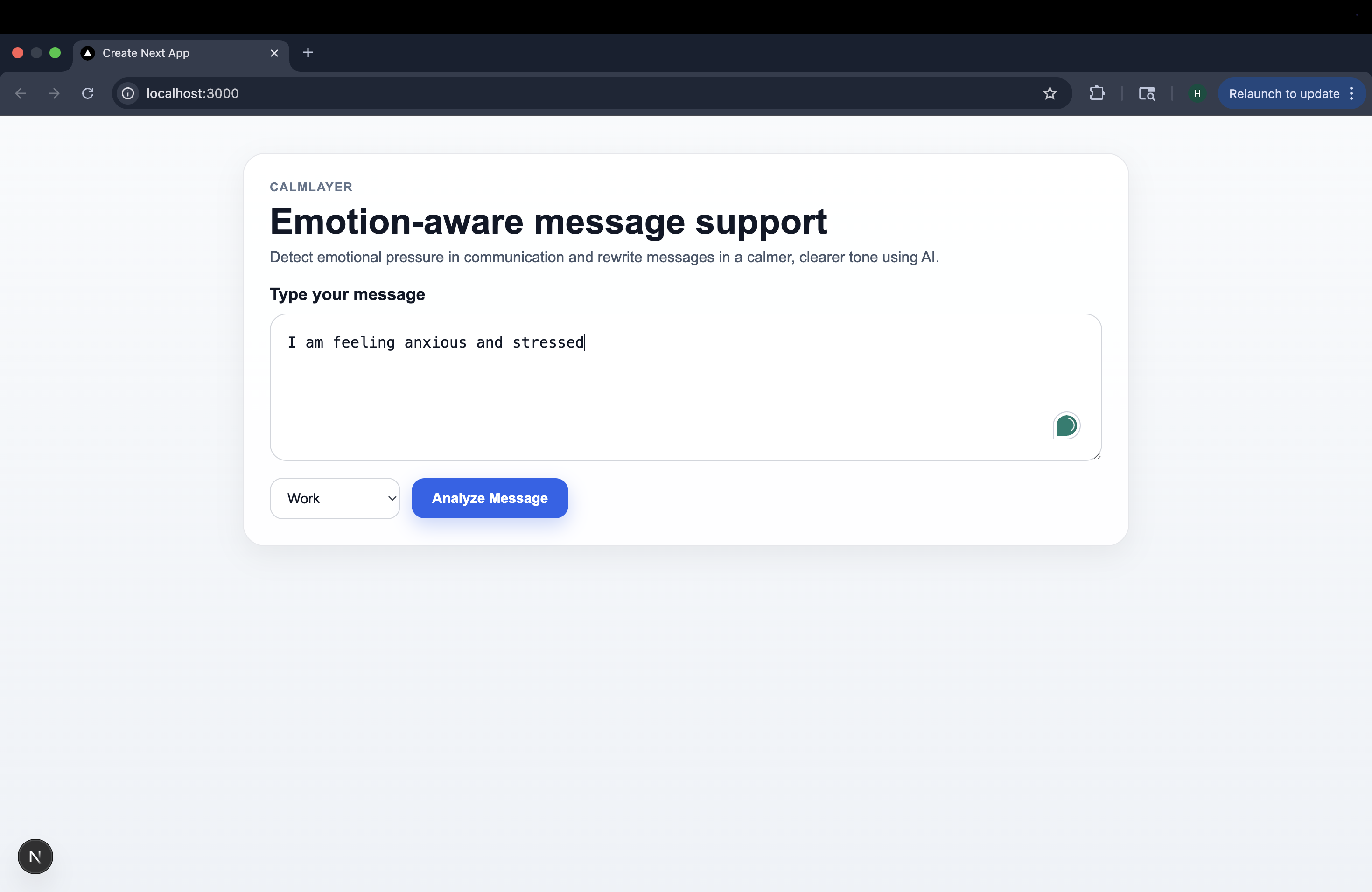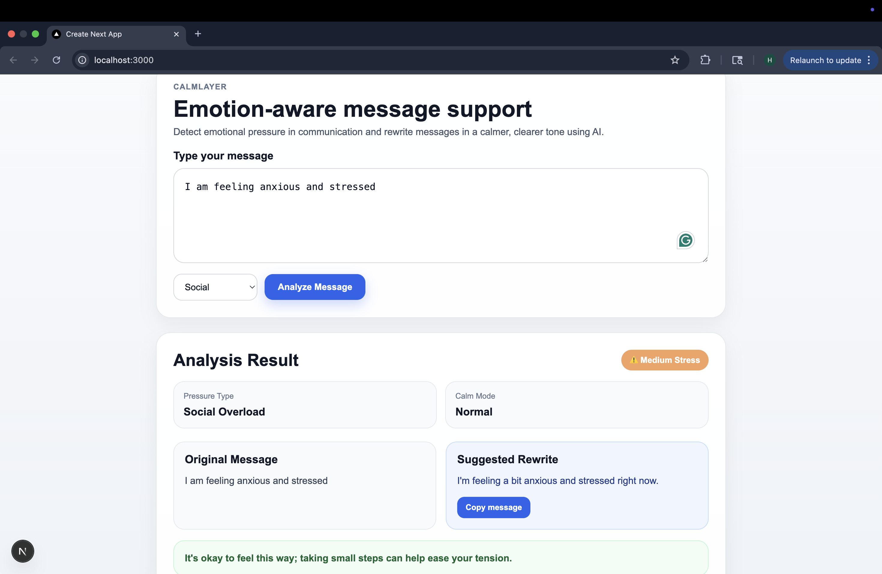 As students, stress is just part of the deal. Deadlines, group projects, internship rejections, and professor emails you are not sure how to respond to. It's a lot. And most of it plays out over text. We noticed something about ourselves during particularly overwhelming weeks. We'd open a message, feel our chest tighten, and start typing back immediately - fast, defensive, sometimes passive-aggressive. Not because we wanted to be difficult, but because we were exhausted and nobody had taught us what to do with that feeling in a digital space. One of us sent an email to a professor that came across way harsher than intended. Another fired off a message in a group chat mid-panic that derailed the whole project dynamic. We have all had that sinking feeling after hitting send - that didn't come out right. And the worst part? You can't take it back. What frustrated us wasn't just the regret; it was that the tools we use every day to communicate have no awareness of how we're feeling. Your keyboard doesn't know you're overwhelmed. Your messaging app doesn't know it's finals week. Nothing pauses to say, "Hey, are you sure about this one?" That gap felt like a real problem worth solving. So, we built CalmLayer, an AI-powered assistant that detects stress in the messages you type, gives it a name, and suggests a calmer way to say the same thing. Not to silence you or sugarcoat your words, but to give you back the version of yourself that gets buried when stress takes over. We built this as students, for students, but honestly, for anyone who has ever let a hard moment speak louder than their better judgment. Because we think communication deserves a little more grace. And sometimes, all it takes is one calm rewrite to change the entire outcome of a conversation.