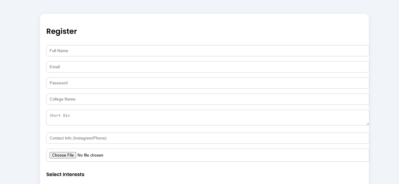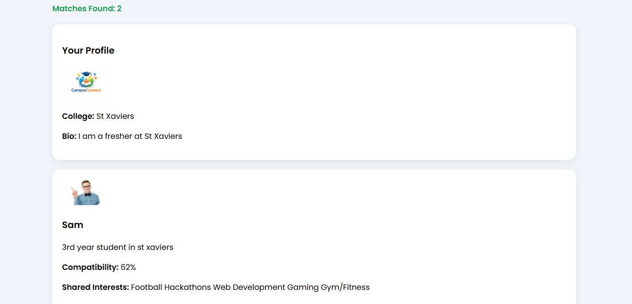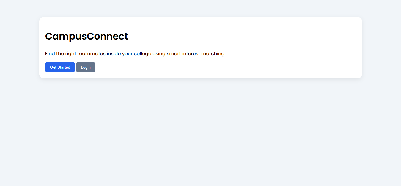 As an introverted student, I often found it difficult to approach others and form teams for academic projects, hackathons, or competitions. Many students face the same problem — having skills and ideas but lacking an easy way to connect with the right people. Campus Connect was inspired by the need to create a structured, low-pressure platform where students can discover and connect with compatible teammates based on shared interests and skills.