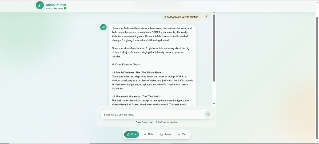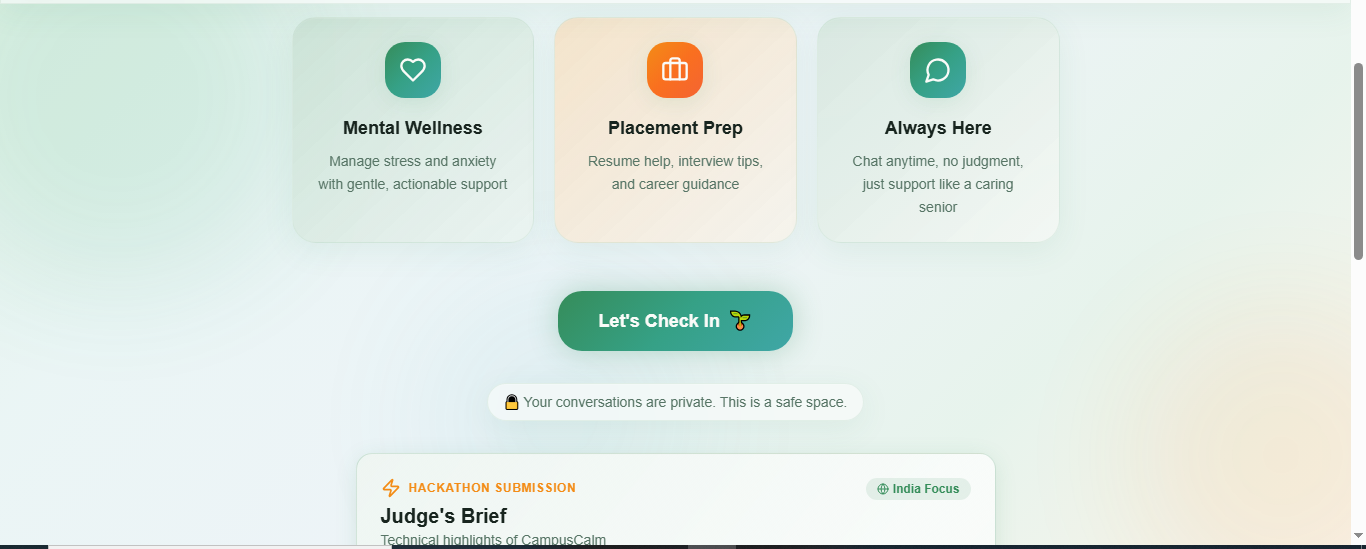 TL;DR: An AI-powered mental health + career companion that understands Hinglish, detects crisis moments, and proactively helps Indian students navigate placement anxiety while building their careers.