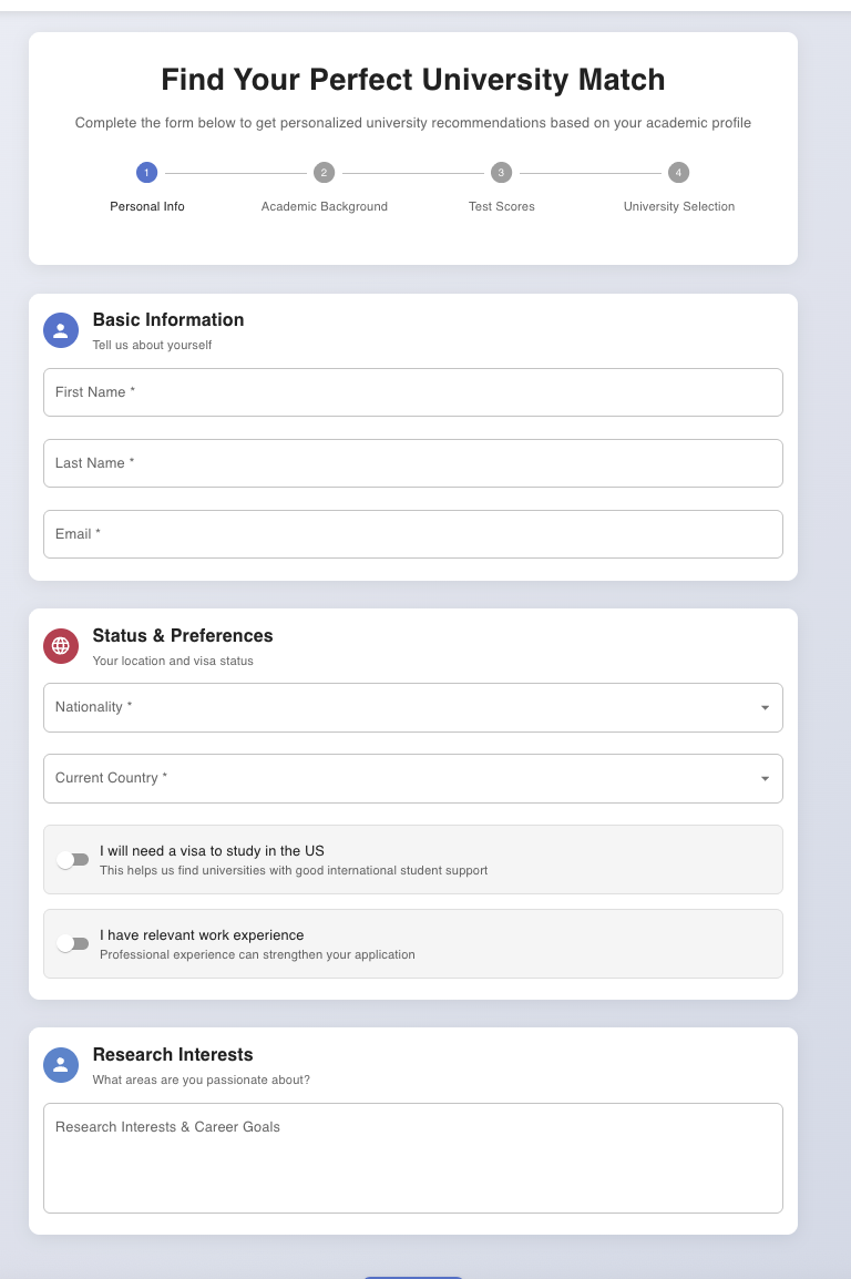 - Diversity of profiles: Different GPAs, research areas, test scores, budgets, and constraints (location, visa timelines) demand personalized results.