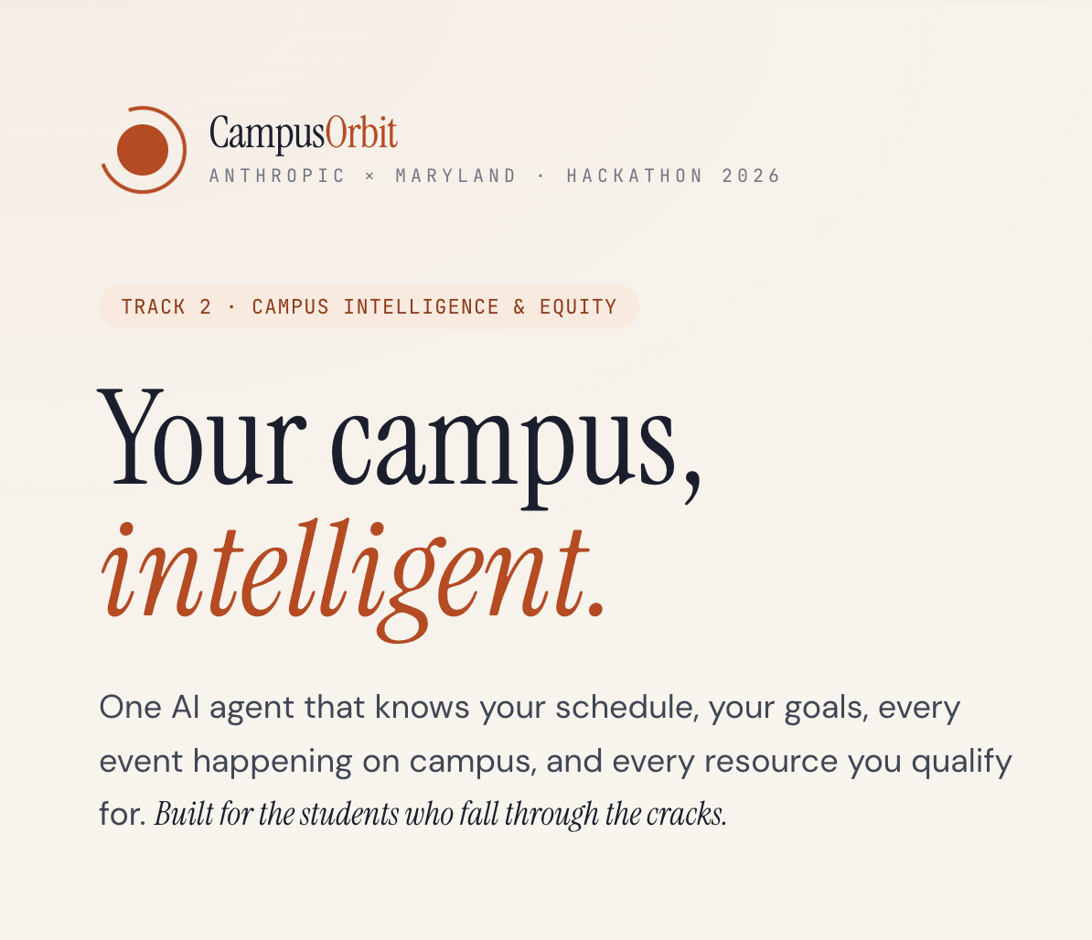 We built CampusOrbit for students overwhelmed by navigating campus systems—especially first-gen, low-income, transfer, and non-traditional students. Universities offer many resources, but they’re scattered across portals and hard to navigate. Students miss opportunities not because they don’t exist, but because they’re difficult to find and prioritize. CampusOrbit solves this by acting as a personalized campus agent that turns complex information into clear, actionable next steps.