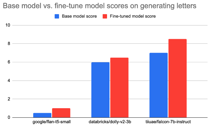 We experimented with three open source large language models: tiiuae/falcon-7b-instruct, databricks/dolly-v2-3b, and google/flan-t5-small. We entered the same prompt (see Input example above) for each model and then annotated the quality of the output letter on a scale of 0-10 (see Figure 1).