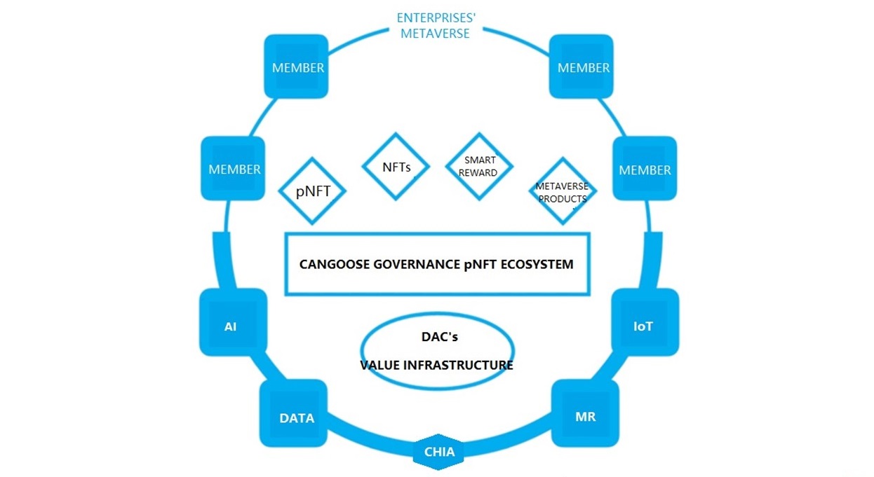 - CANGOOSE’s governance pNFT is using the Green blockchain Chia Network as infrastructure, create pNFT(puzzleNFT) model, fully utilize its puzzle like voting, fractional rights and transferable inheritance, to empower the transformation for enterprises into decentralized autonomous organization(DAO). For example, For example: in a automotive vehicle manufactory, a employee in a production department for making parts, can vote his or her right to a upper management using pNFT governance right all the way to CANGOOSE. In order to improve a smarter management environment for business operation and increase liquidity, CANGOOSE will separate this pNFT for the business into governance right and digital asset two parts. During this process, business will result in a smarter management at no additional cost.