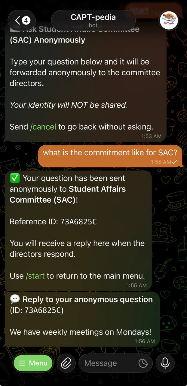 Overall, the bot functions as a single, organised touchpoint within Telegram, reducing information fragmentation and providing freshmen with a convenient, accessible, and user-friendly way to explore and engage with RC committees.