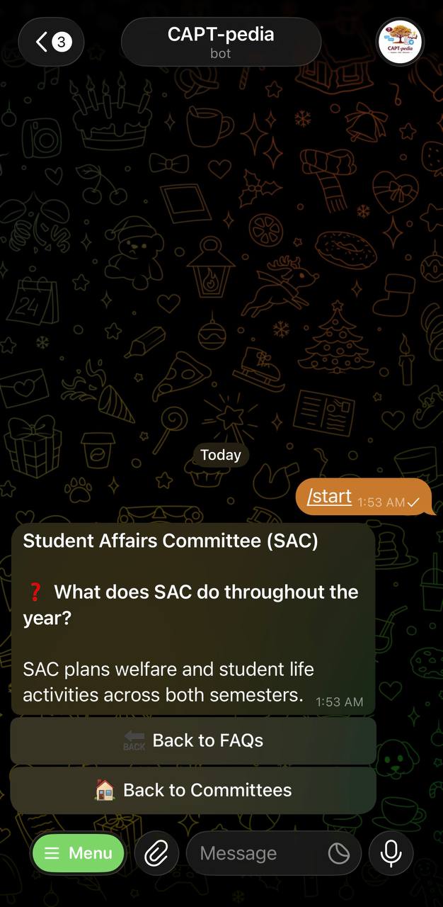 Upon starting the bot, users are presented with a menu of available committees. By selecting a specific committee, the bot sends a structured message containing a concise overview of the committee, including its roles and responsibilities, expected commitment level, and application details. This message also includes relevant links such as the committee’s Instagram page, Telegram channel, and contact details of project directors. Users can further navigate through interactive prompts to view frequently asked questions (FAQs) about the selected committee, allowing them to quickly access common information without needing to search across multiple platforms.