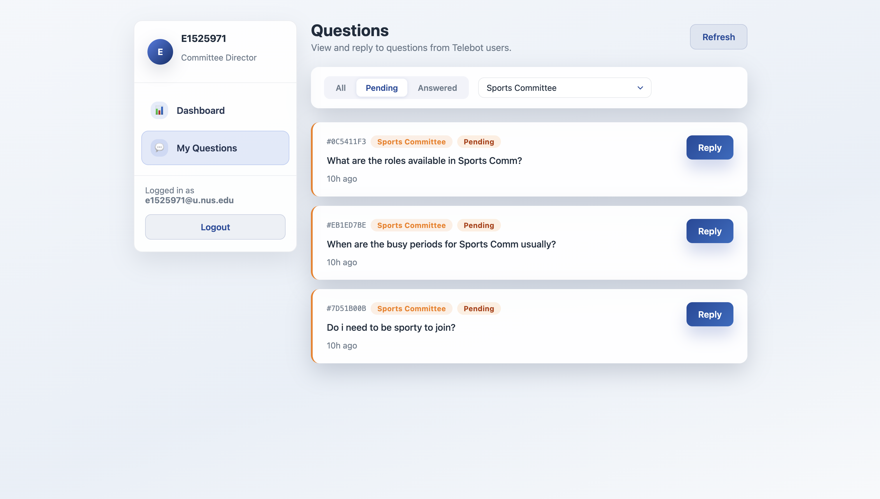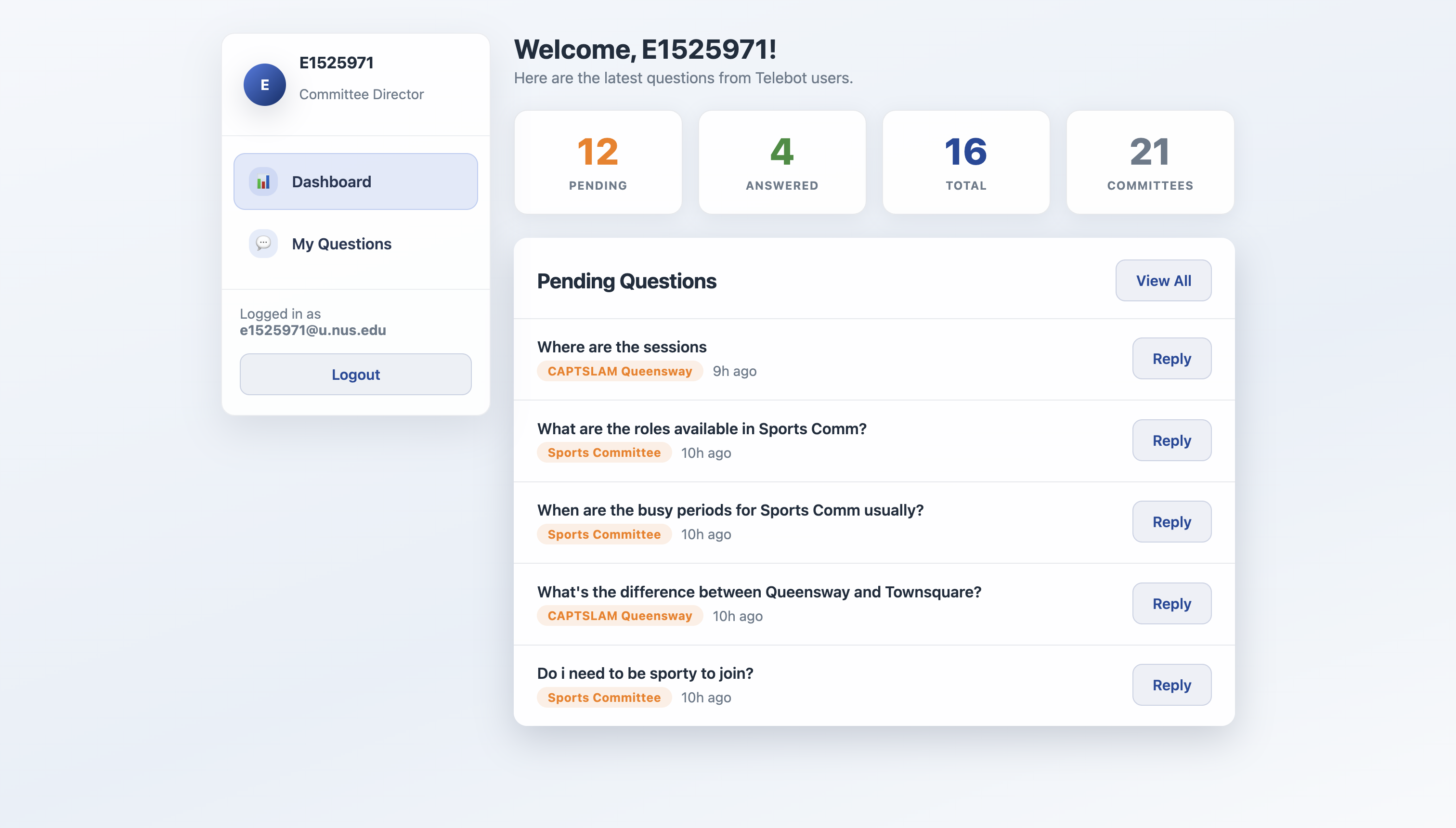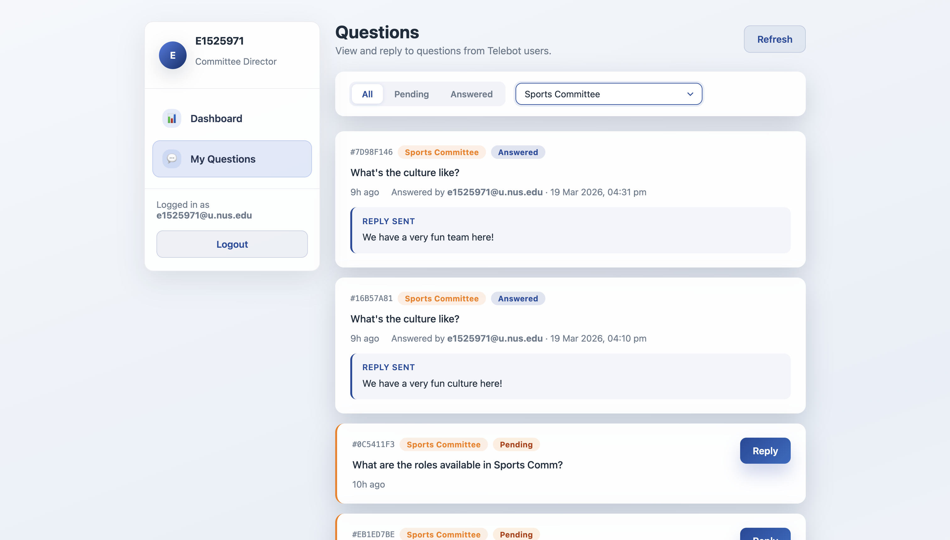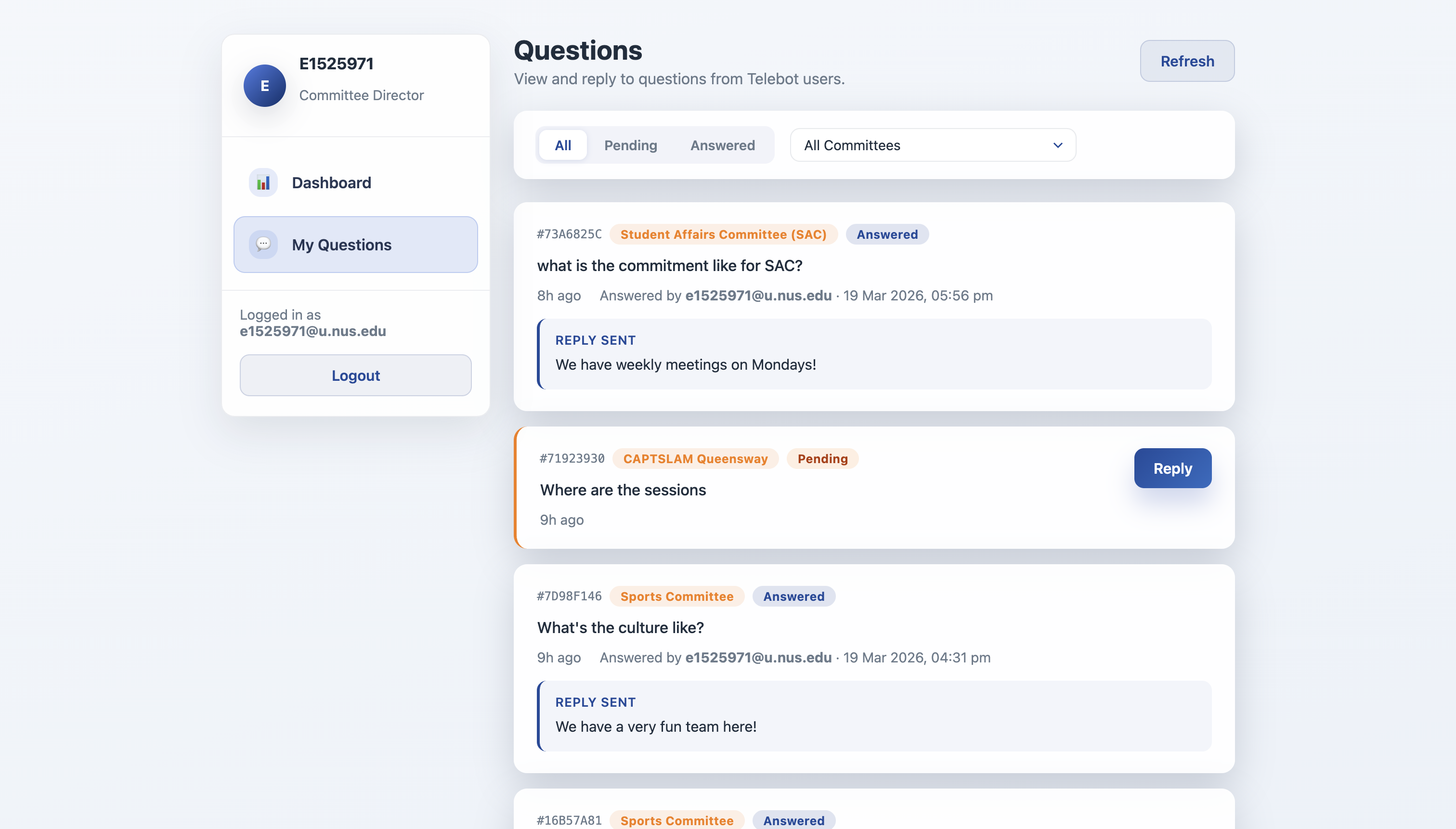 For queries that go beyond the provided FAQs, the bot includes a feature that allows users to submit personalised questions anonymously. These questions are routed to a centralised web-based dashboard accessible by committee project directors, where they can view and respond to incoming queries. Responses are then relayed back to the user through the bot, ensuring a seamless and private communication channel. This anonymity feature helps to lower social barriers, encouraging freshmen—especially those who may feel shy or hesitant—to ask questions more freely.