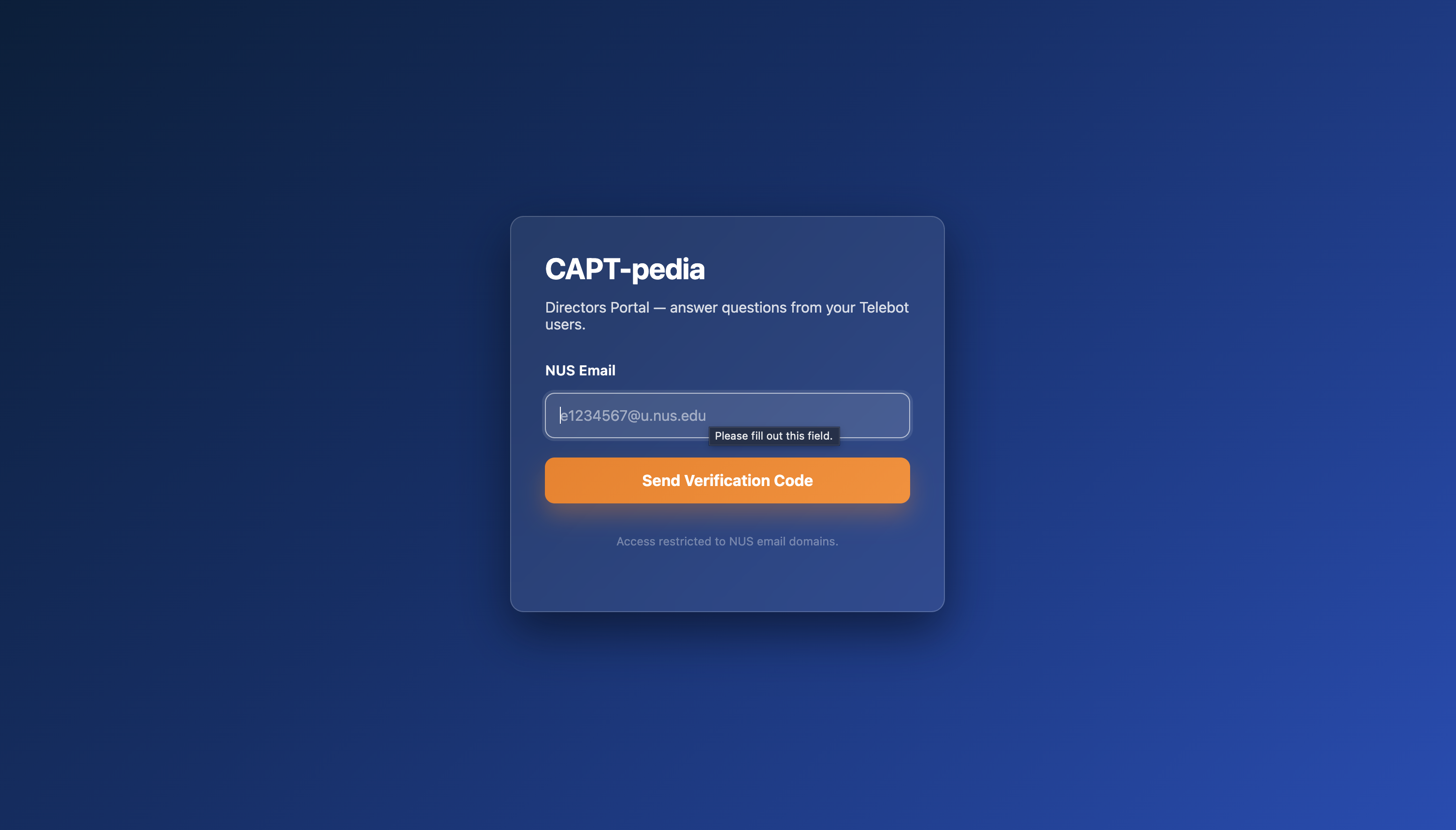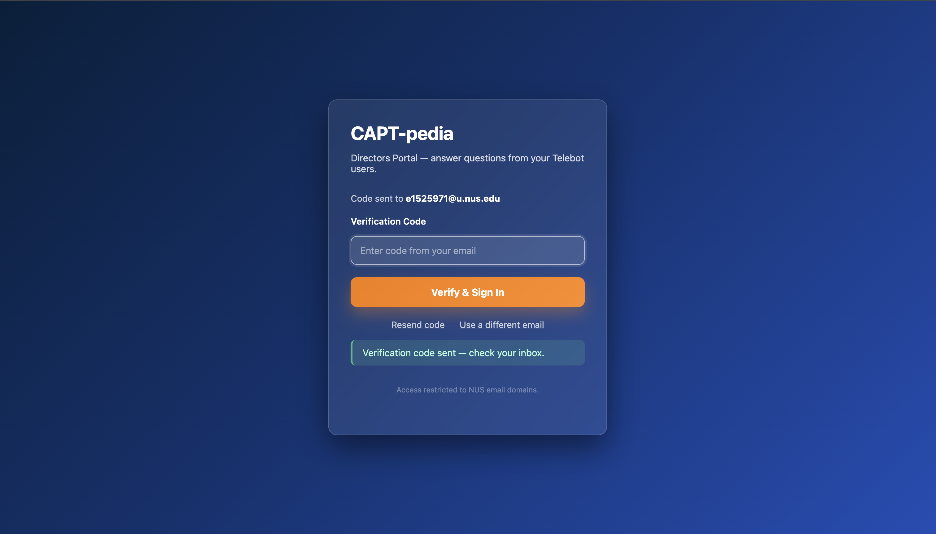 CAPT-pedia is a full-stack Telegram-to-web Q&A platform built for CAPT committees. It combines a Python Telegram bot (python-telegram-bot) with a FastAPI directors portal, backed by a shared SQLite/SQLAlchemy database. Freshmen browse committee info and submit anonymous questions through Telegram, while directors authenticate via email OTP (SMTP + JWT cookie session), view pending questions in a React/Vite dashboard, and send replies that are delivered back to users through the Telegram Bot API. The architecture is modular and lightweight, with secure OTP controls, domain restrictions, hashed verification codes, and a clean pending→answered workflow across bot and portal interfaces.