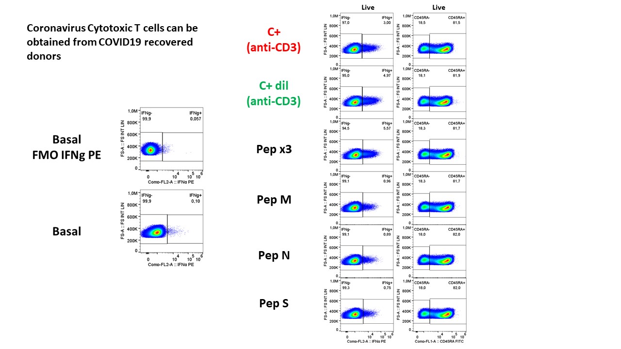 As a consequence of the great impact produced by COVID-19 in the global health, social and economic spheres, there is an urgent need to carry out clinical trials to evaluate current and novel treatments against the coronavirus. The virus is continuing its spread across the world, with about 2.8 million confirmed cases of coronavirus now in 185 countries and at least 197,500 people have died. In addition to general measures of care, therapeutic interventions that are being investigated include lopinavir / ritonavir, darunavir / cobicistat, remdesivir, ribavirin, ASC09, favipiravir, umifenovir, oseltamivir, baloxavir, rhACE2 antibodies, REGN-3048/REGN-3051, GD31 nucleoside analogues, chloroquine and carrymicin, as well as other less specific treatments such as corticosteroids, interferon alfa, etc. Vaccines are also being pursued actively, but they will not be protective in the next few months when SARS-CoV-2 is rapidly spreading worldwide. Instead of active immunization that takes time, passive immunity can be acquired immediately via transfusion of plasma or immunoglobulins from donors who have recovered from COVID-19. Another form of passive immunotherapy is adoptive transfer of SARS-CoV-2 specific T cells from convalescent donors into newly infected patients. Coronavirus cytotoxic T lymphocytes can be obtained through large-scale immunomagnetic capture systems after stimulation with specific coronavirus antigens (M, N, and S proteins of the viral capsid) and Interferon-gamma release, as we currently do in the context of immunocompromised patients or in hematopoietic transplantation in patients with reactivations or disease due to cytomegalovirus (CMV) or Epstein Barr virus (EBV). Our hypothesis is that these lymphocytes contain a high proportion of SARS-CoV-2 specific T cells and are safe and effective in treating patients with severe SARS-CoV-2 infections. Most hospitalized COVID-10 patients develop severe lymphopenia, so adoptive transfer of SARS-CoV-2-specific T cells can lead to critical control of the virus until patients develop their own immunity and reject donor cells. This is a project in collaboration with Sing-Health Singapore (KKH women´s and children´s Hospital), Professor Wing Leung and with the support of the Spanish Society of Hematology and Hemotherapy (SEHH). The main objective of the project is to develop an emergency treatment protocol using adoptive T-cell therapy to treat severe cases of COVID-19. This is a randomized phase I / II clinical trial to determine the safety, tolerability, alloreactivity and efficacy of SARS-CoV-2-specific T cells. The objective is to ensure that the HLA spectrum will cover at least 90% of the general population, when the donor must share at least one HLA antigen with the recipient. As the cells are consumed and the epidemic worsens, more donors will be recruited to ensure they stay above 90% compatibility. A minimum of 8 patients will be recruited. Eligible recipients will receive a single infusion of specific T cells. In phase I, 1 to 6 patients will be recruited, in which two dose levels will be studied: 50,000 cells/m2 and 150,000 cells/m2 (if no major grade 3 toxicities are detected in the first cohort). In phase II, 12 patients will initially be recruited, being able to expand according to the demand marked by the epidemic, who will be administered with the appropriate dose according to the results of phase I. If this study is effective, the mortality rate will decrease, the patient will recover sooner, and the long-term adverse effects of organ infection will decrease. This would mean a considerable improvement in the global health, social and economic crisis caused by COVID-19 pandemic.