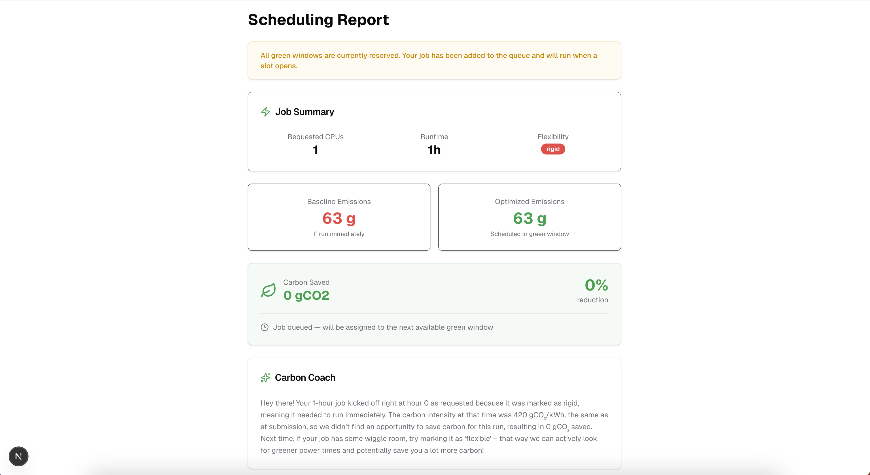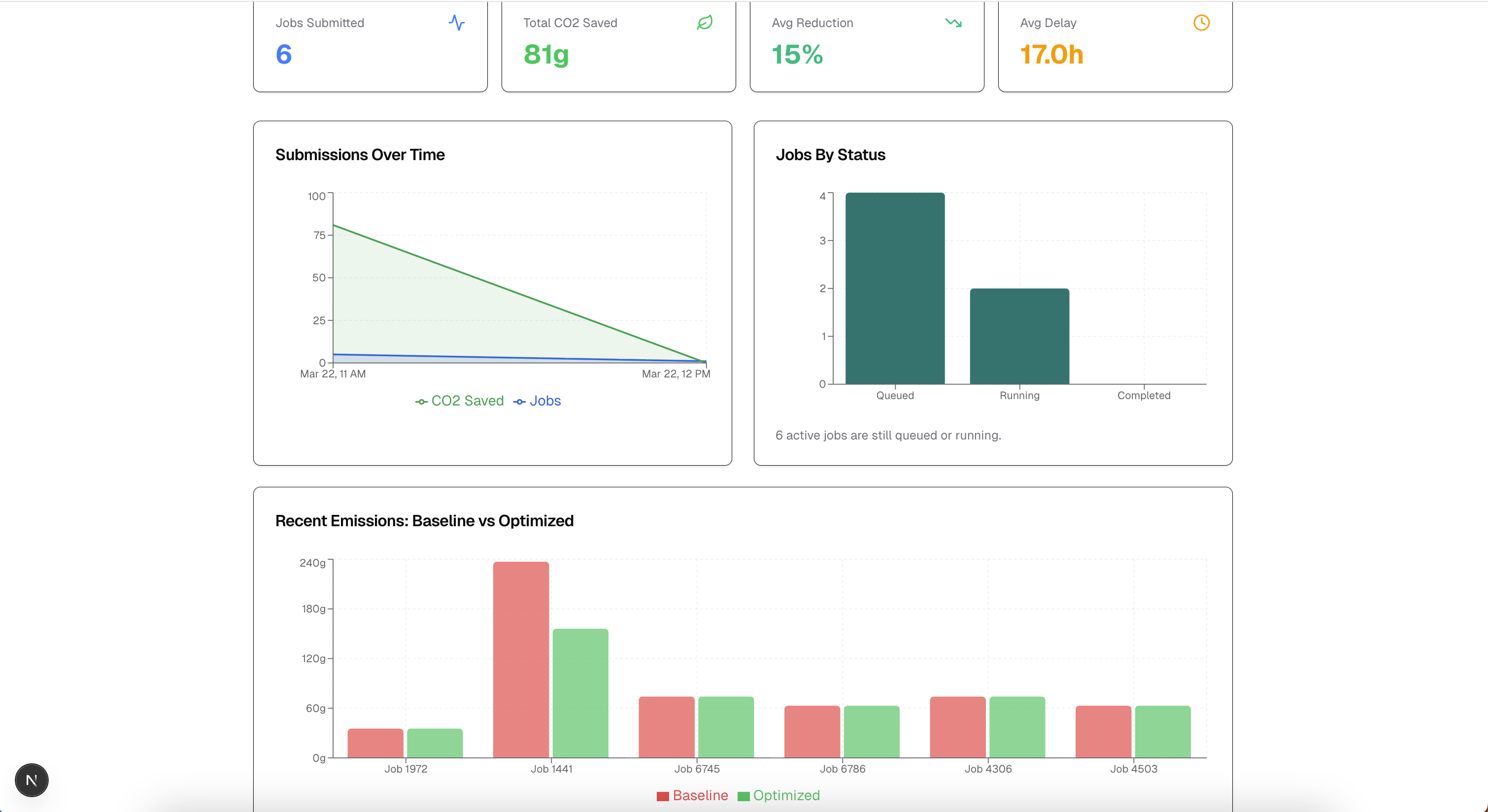 Transparent Accountability: Users receive a dashboard showing the “Baseline vs. Optimized” carbon footprint of their specific computations.