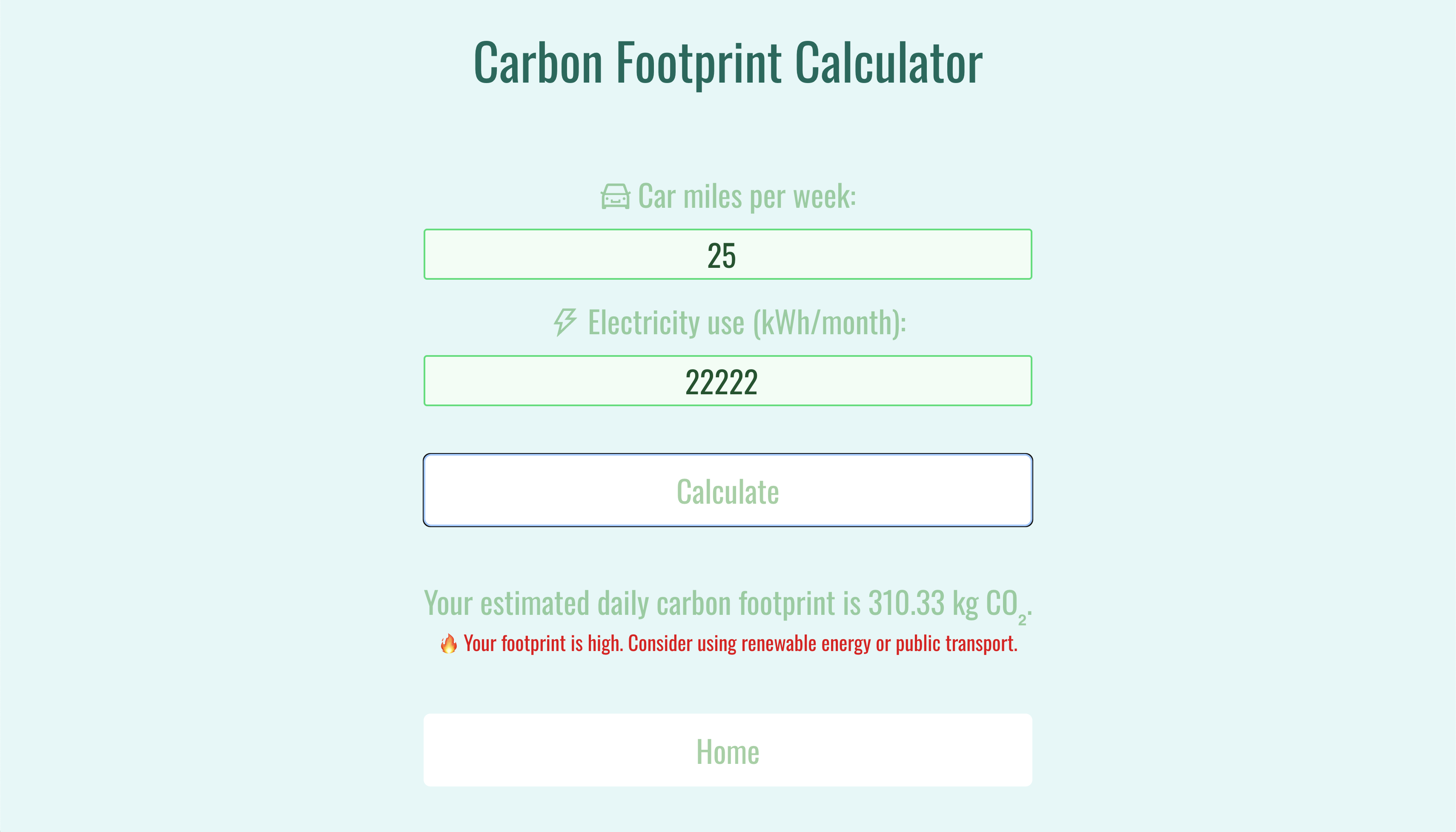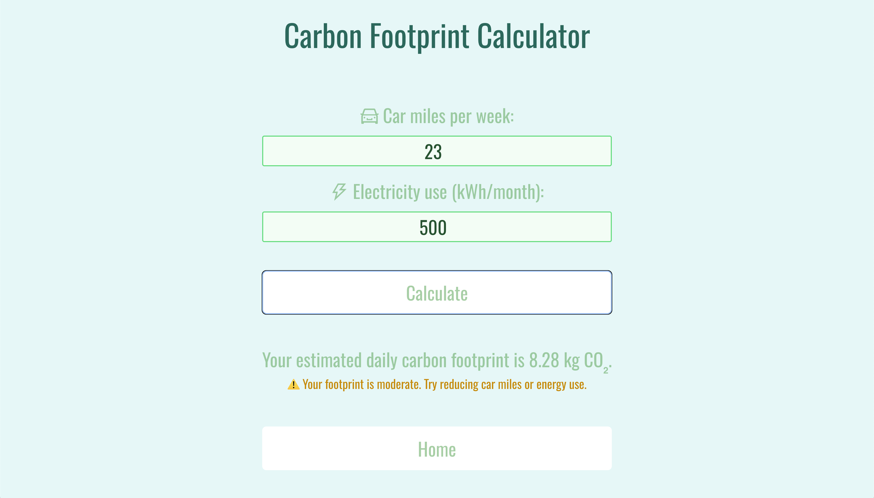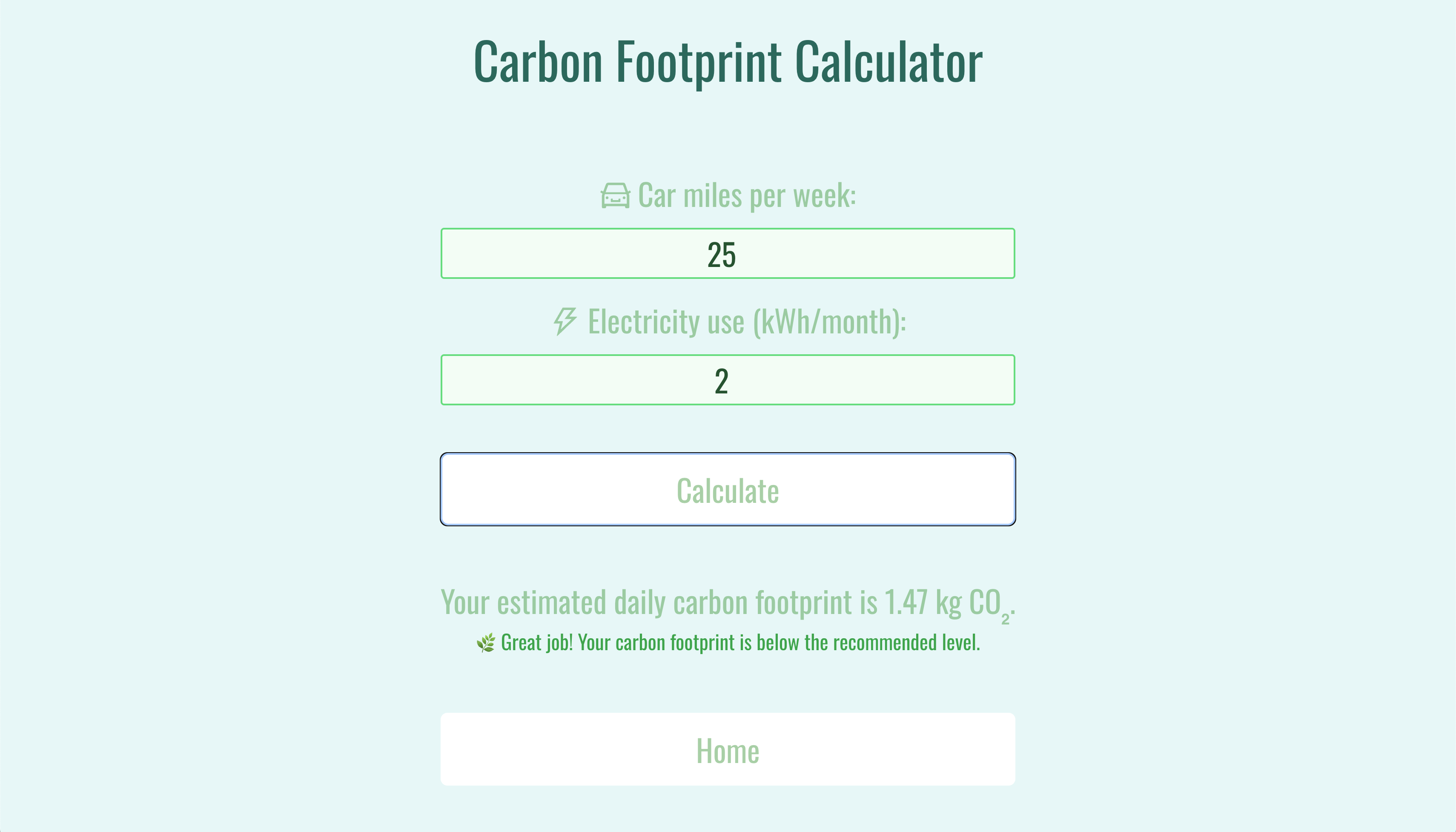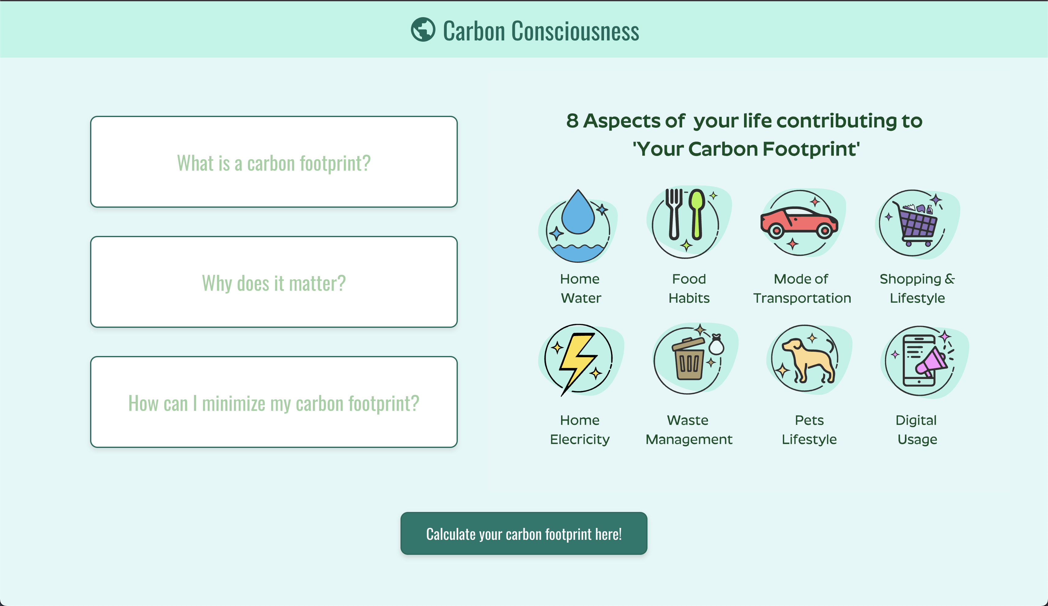 Our website, “Carbon Consciousness,” gives a quick introduction to carbon footprint and its impact on Earth. Through informational cards and examples, our website provides a good amount of knowledge on carbon footprint for anyone who may lack an understanding. In addition, the website contains a calculator for any user to input their carbon footprint through mileage and electricity consumption and find out if they live sustainably. By measuring in kilograms (kg), users can gain a better understanding of their own contributions to greenhouse gases and create healthier practices for everyday life.