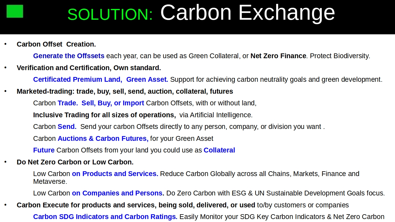 Carbon Exchange Marketplace , where people and companies can certify, buy, sell, send their carbon credits, offsets. and do Net Zero Carbon, aligned with the UN Sustainable Goals, and ESG for Business. in a Low Carbon Economy, your place for trading Carbon in Polkadot /Substrate.