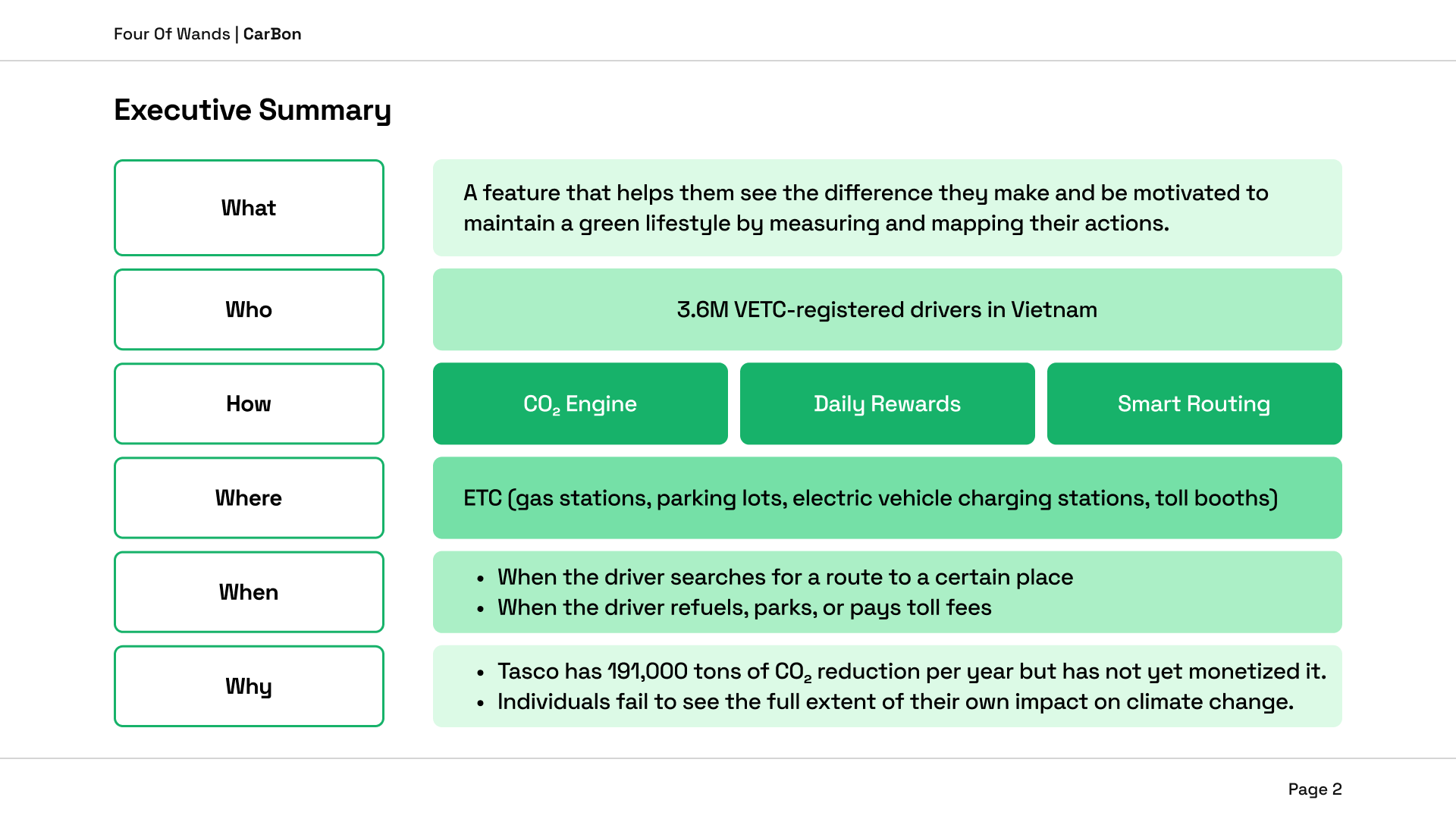 The MAU → DAU insight. The VETC app is currently opened only when users need to top up — a monthly, transactional interaction. CarBon turns it into a daily ritual: check the ring, complete tasks, earn points, see your impact. This shift from Monthly Active Users to Daily Active Users is the single most valuable thing CarBon delivers to Tasco as a business — independent of carbon.