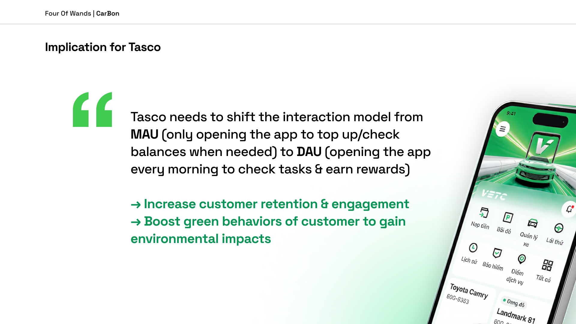 The key business shift: CarBon transforms the VETC app from MAU (users open it only to top up or check balance) to DAU (users open it every morning to check tasks and earn rewards) — increasing customer retention, enabling cross-selling across Tasco services, and generating real environmental impact simultaneously.