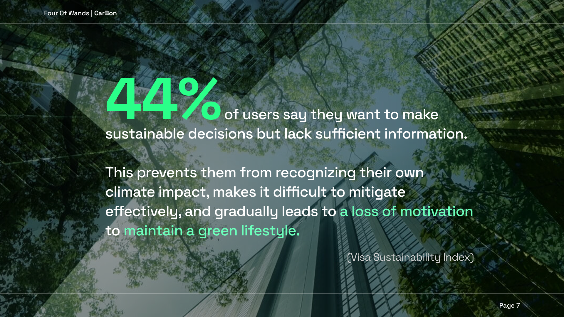 Behavior change is a product problem, not a communication problem. 44% of people want to be more sustainable but lack information. The solution is not more information — it is a feedback loop. Immediate, specific, rewarding. CarBon's entire design is built around this insight: the 3-second ETC notification, the daily ring, the streak. The environmental impact is the outcome; the feedback loop is the mechanism.