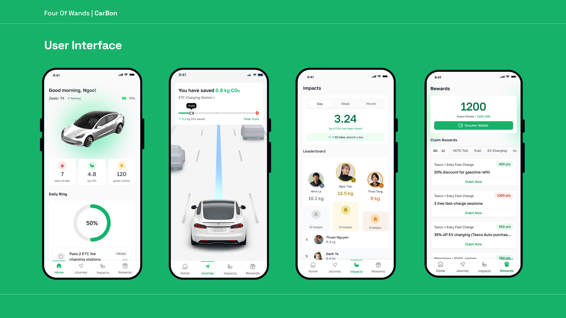 Green Impacts & Rewards — The Impacts screen shows personal CO₂ reduction (daily / weekly / monthly), a community leaderboard, and tangible equivalents. Users see their tiny daily action as part of something city-scale. Green Points are redeemable across the Tasco ecosystem: VETC toll credits, fuel discounts, EV charging, Carpla servicing, Tasco Insurance, and rescue coverage.