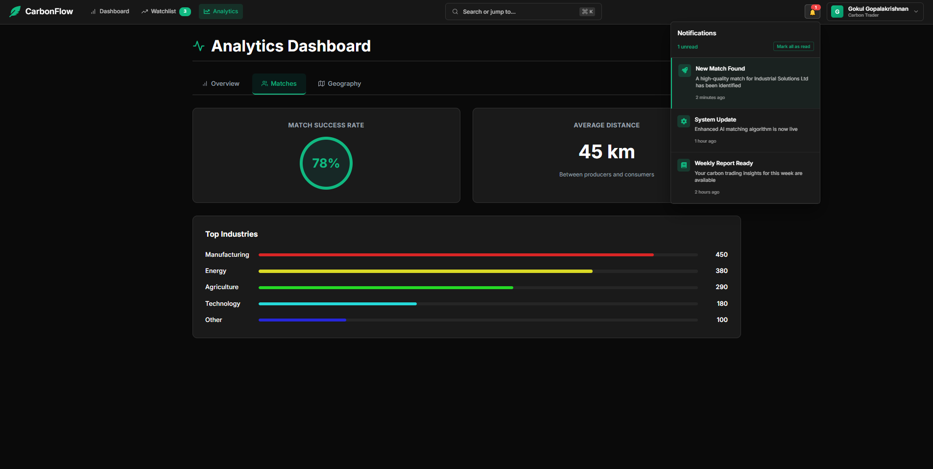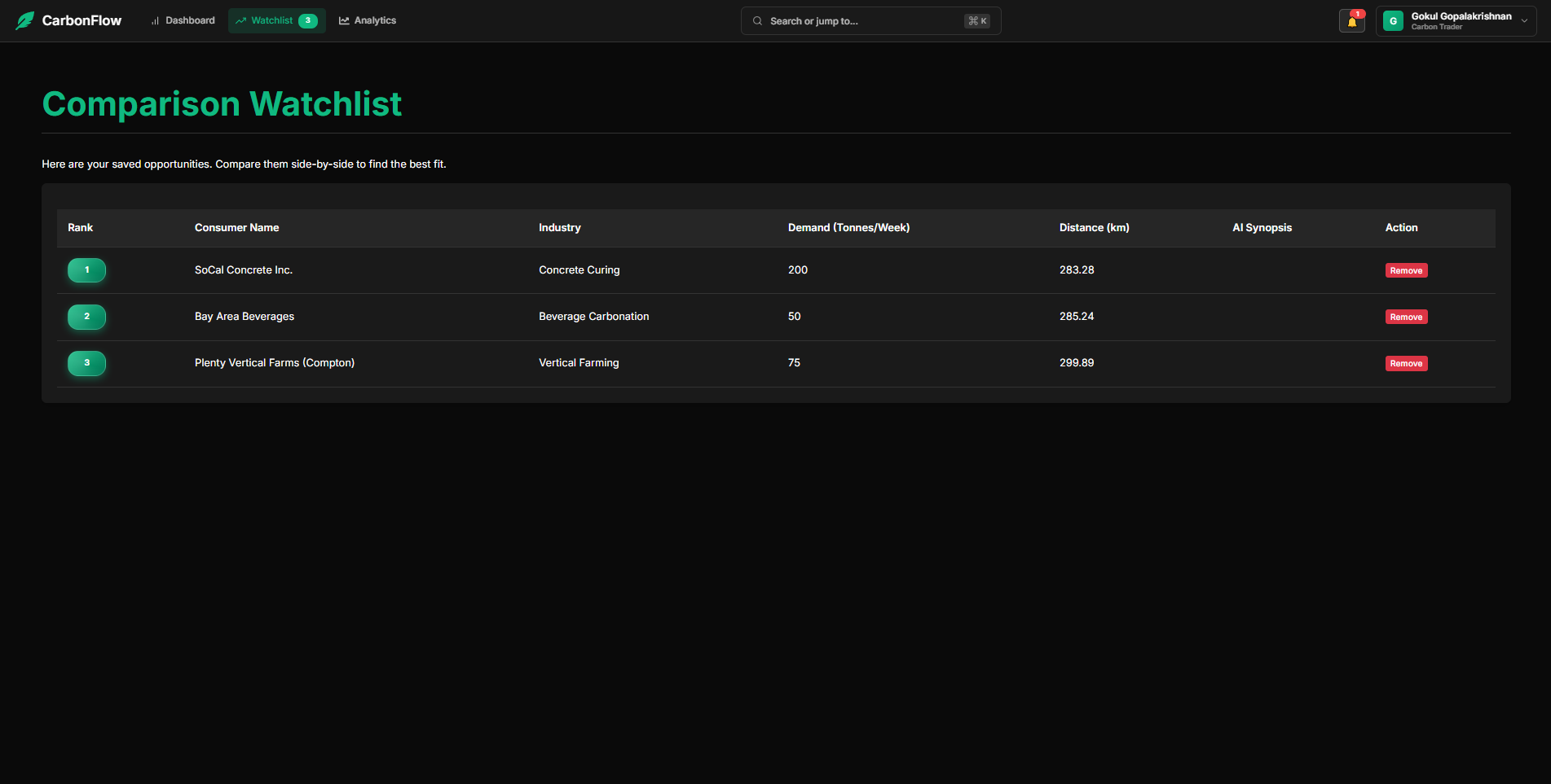 What it does CarbonFlow is a full-stack, AI-powered marketplace that connects CO₂ producers with consumers. It features a secure user authentication system, an intelligent vector-based matching engine to find the best partners, and an AI consultant that provides a ranked report with a detailed justification for each match. The platform is a true two-sided marketplace, with dedicated dashboards for both producers and consumers.