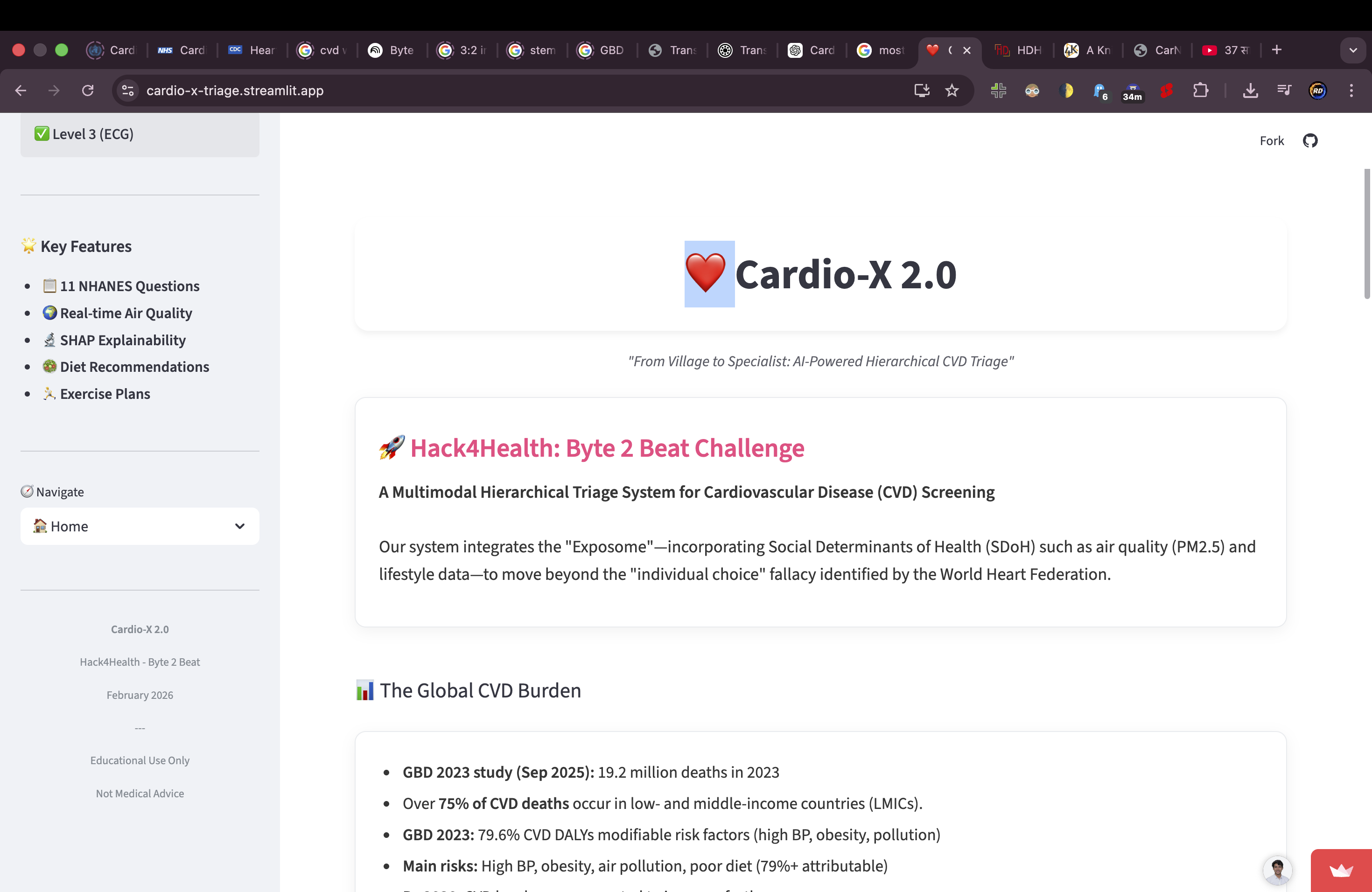 Cardiovascular disease kills ~17.9 million people per year, yet early detection is bottlenecked by expensive hospital systems. I noticed a disconnect: community health workers collect vitals and environmental data daily, but have no tool to triage who actually needs a cardiologist. I wanted to build a system that bridges this gap — from village screening all the way to specialist-grade ECG analysis — using nothing but existing public datasets and open-source ML.