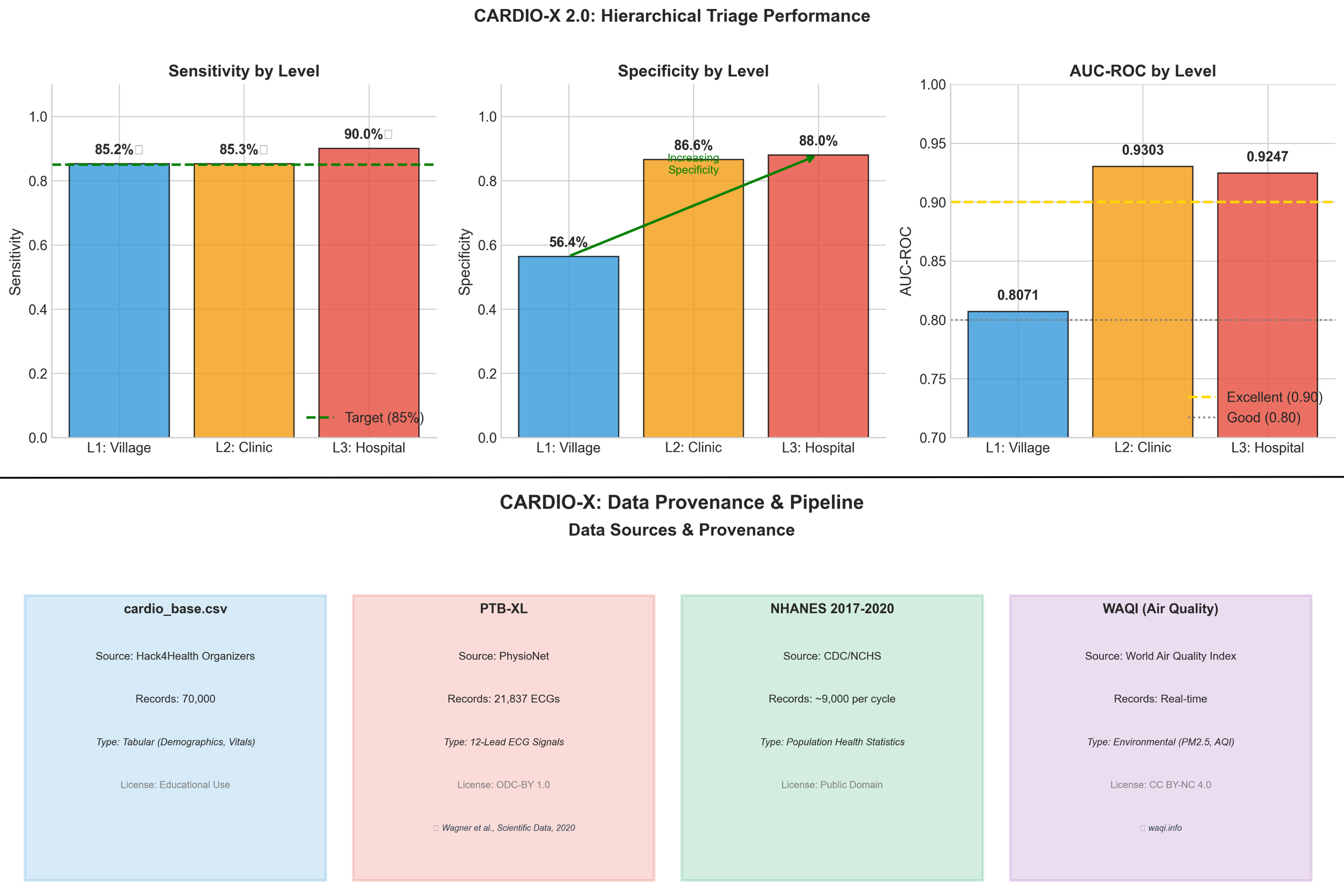 - By filtering 85% of truly at-risk patients at Level 1 using only a smartphone, the system reduces unnecessary specialist referrals. In India's public health system (1 cardiologist per 100,000 people), this hierarchical filtering could save an estimated 40% of specialist consultation time.