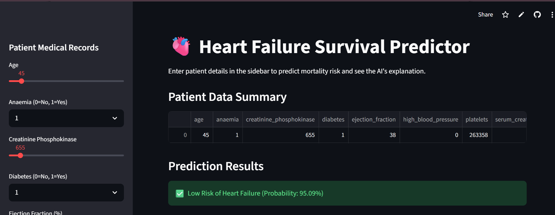 Interactive Inputs: Users can input 11 clinical features (like Age, Ejection Fraction, Serum Creatinine, and Creatinine Phosphokinase) using intuitive sliders and dropdowns.