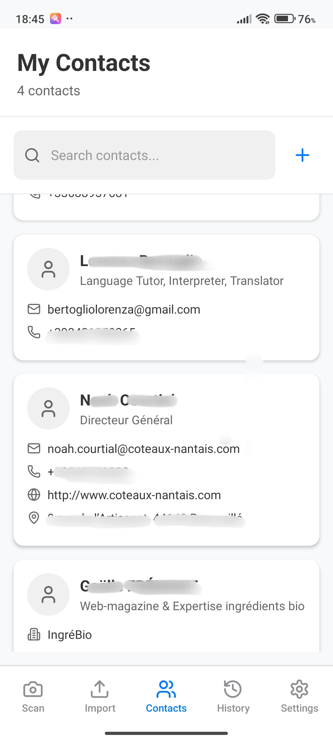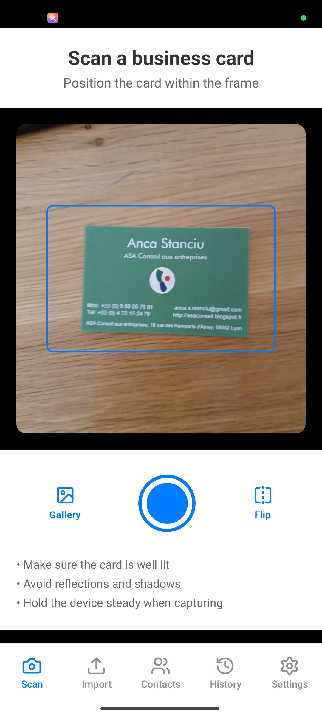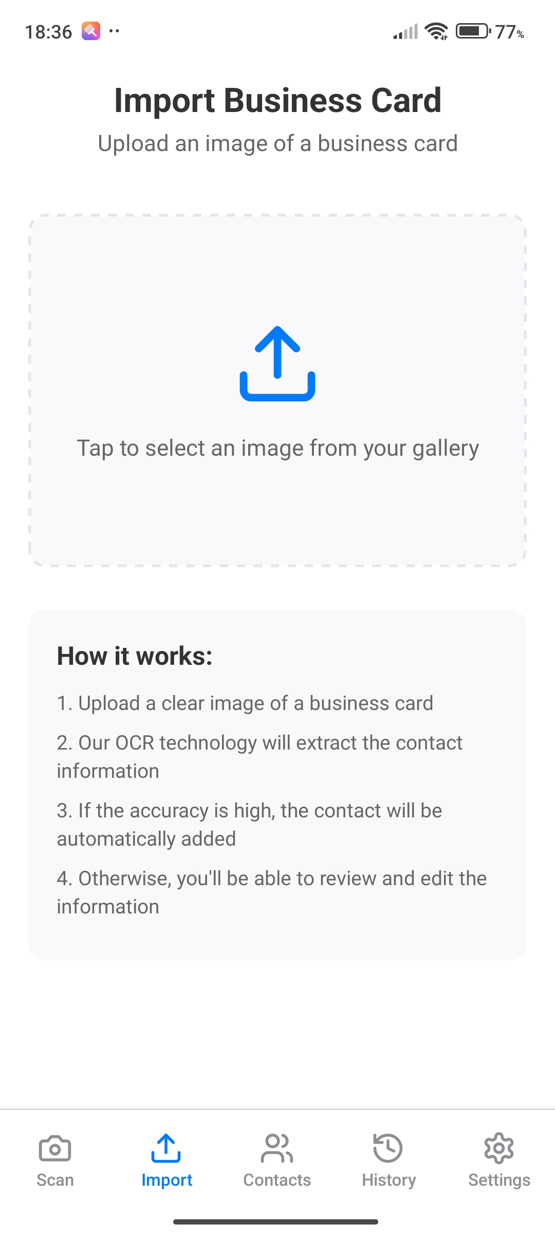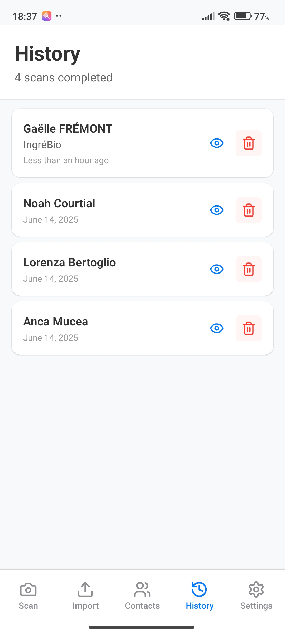 We designed Cardly with a focus on simplicity and smooth user experience. The app uses the device camera to capture card images, processes them with an OCR engine, and parses the extracted text into contact fields. The workflow is optimized for both real-time scanning and bulk import after events.