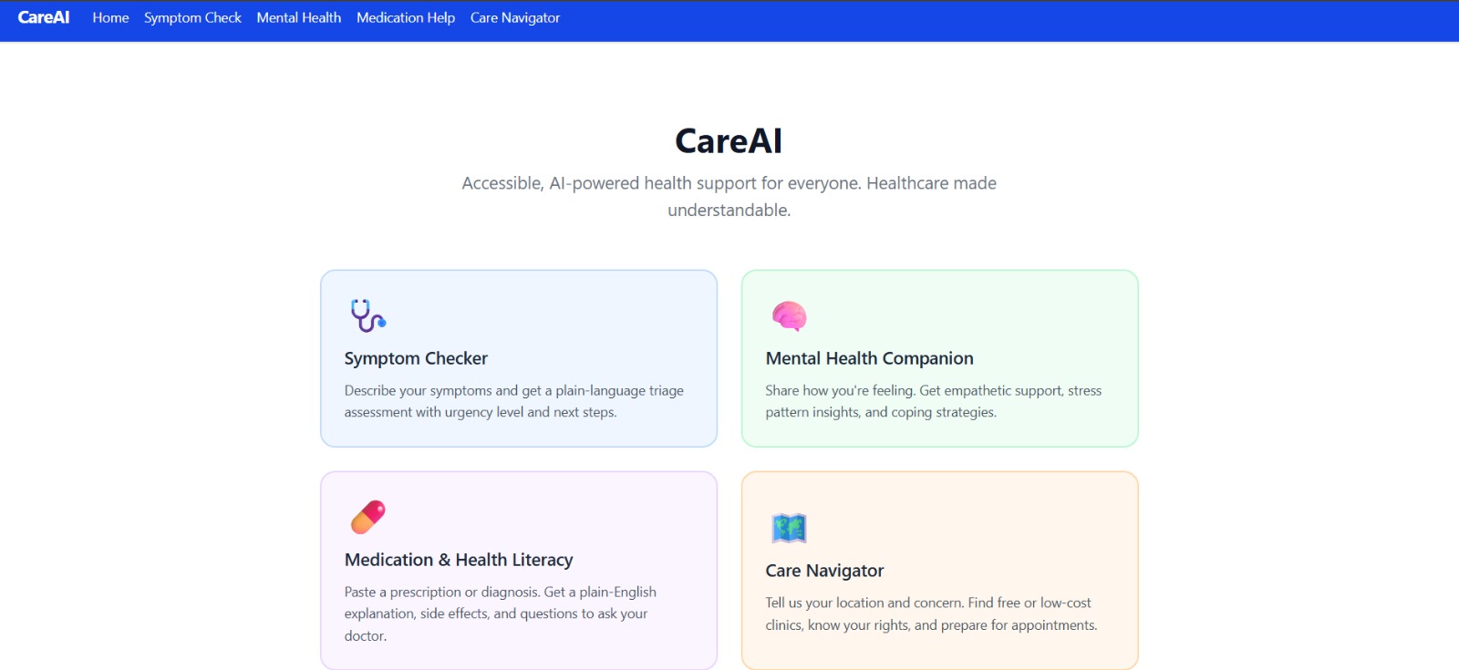 CareAI is a four-in-one AI-powered health companion that democratizes healthcare access. Each tool addresses a distinct barrier people face:
