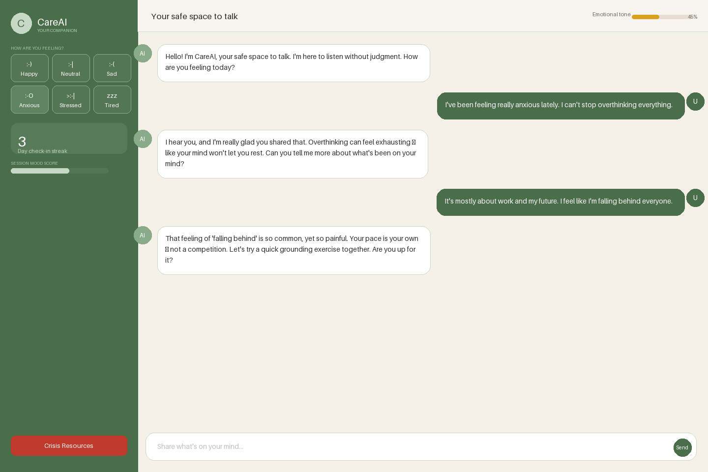 CareAI is an AI-powered mental health companion that provides real-time emotional support through empathetic conversation. Here's what it does: