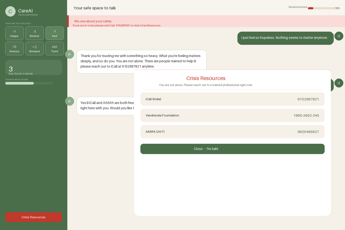 - Crisis detection — CareAI automatically detects distress-related keywords and instantly surfaces a warning banner with verified crisis helplines (iCall, AASRA, Vandrevala Foundation, and international lines).