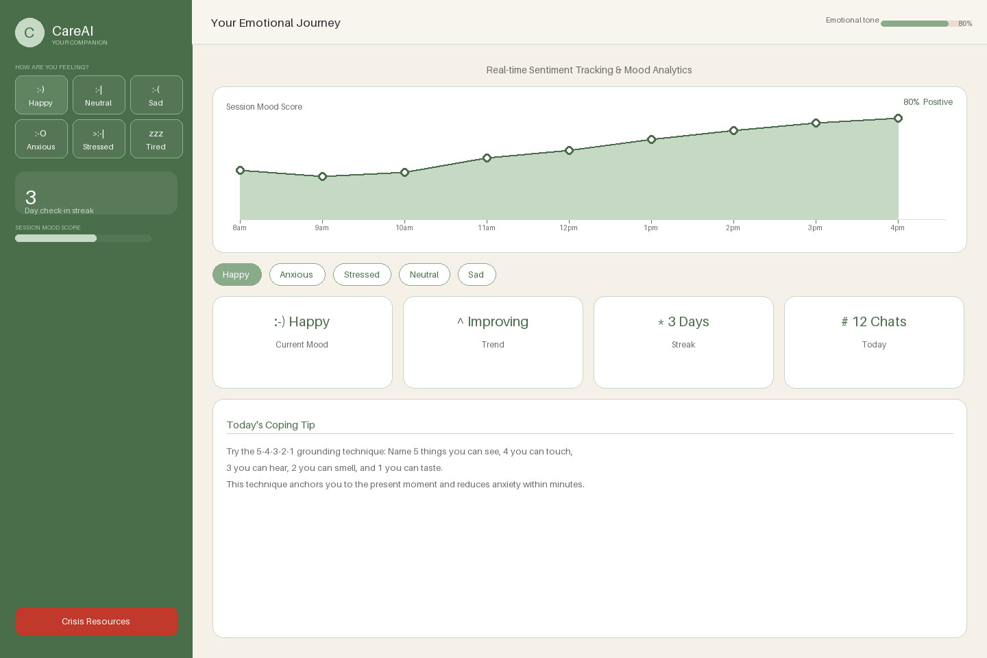 - Real-time sentiment analysis — Every message is analyzed for emotional tone. A live mood bar updates throughout the session, giving users a visual sense of their emotional arc.