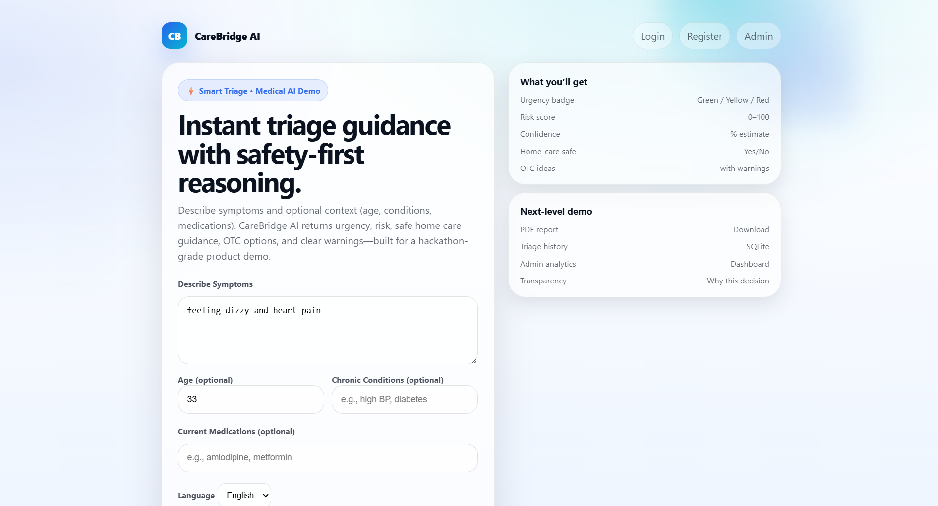 CareBridge AI is an AI-powered clinical triage assistant that: Analyzes user-reported symptoms Detects emergency red flags instantly Assigns urgency levels (Green / Yellow / Red) Generates a risk score (0–100) Provides recommended next steps Suggests safe over-the-counter guidance (when appropriate) Warns about medication and condition conflicts Stores cases in a structured database Provides an admin dashboard with case analytics Generates downloadable PDF triage reports It transforms free-text symptoms into structured medical decision support.