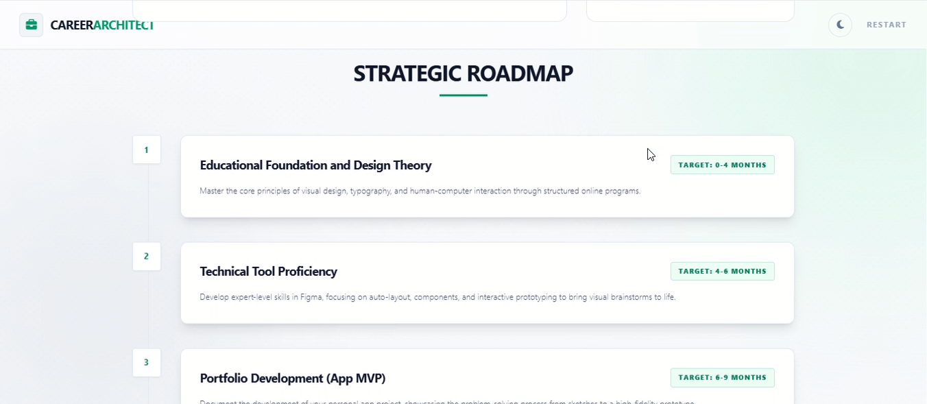 Defining the Persona: At first, the AI was too generic. It would just say "Follow your passion." We had to iterate on the System Instructions significantly to force it to ask probing questions (like "Do you prefer working with data or people?") before giving advice. Output Formatting: Getting the AI to switch from "Chat Mode" to "Roadmap Mode" was tricky. We had to create specific triggers in the prompt logic so that once the user agrees on a career path, the AI automatically shifts to generating the structured timeline. Hallucinations: We had to instruct the model to avoid inventing specific URLs for courses (which might break) and instead focus on providing highly accurate search terms and platform recommendations (like "Search for 'Google Data Analytics Certificate' on Coursera")