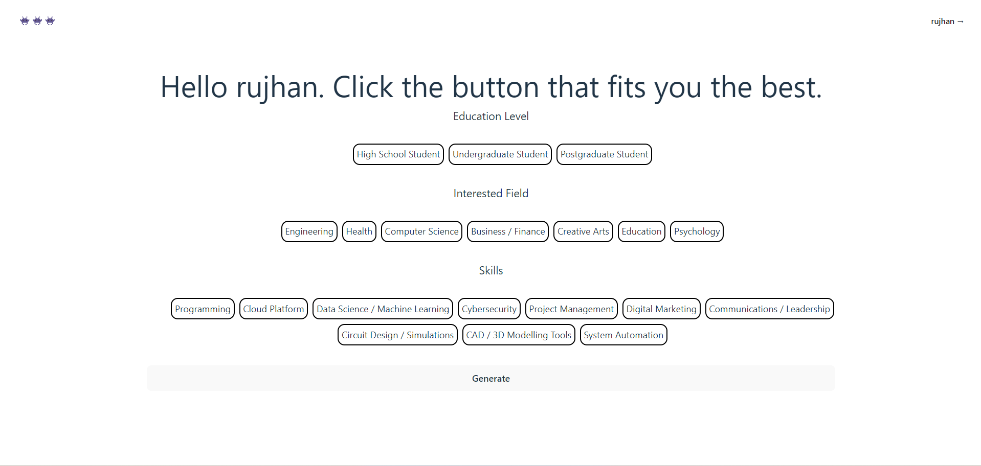 The job market is evolving rapidly, and navigating career paths can feel overwhelming, especially with emerging industries and roles. We wanted to create a solution that empowers students, job seekers, and professionals to make informed decisions with confidence. Our goal was to build a platform that not only advises on the "next steps" but offers a complete roadmap tailored to each individual’s background, skills, and future goals.