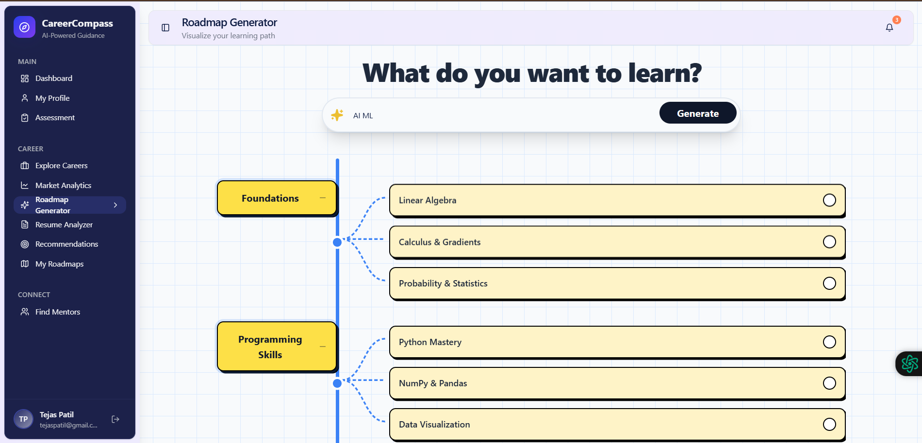 Smart Resume Analysis: Users upload their resumes, and our NLP engine parses them to extract skills, experience, and education. AI-Powered Recommendations: Using brain.js and ml-kmeans, the system matches user profiles against comprehensive career datasets to suggest the most suitable career paths. Skill Gap Detection: It doesn't just tell you where to go; it tells you how to get there. The system identifies exactly which skills a user is missing for their target role. Interactive Roadmap: Users get a visual, step-by-step roadmap to bridge those gaps, effectively turning career planning into a manageable, data-driven checklist. How we built it We built CareerCompass as a modern MERN Stack application with a heavy emphasis on AI integration within Node.js.