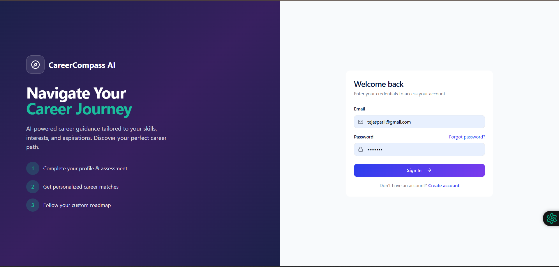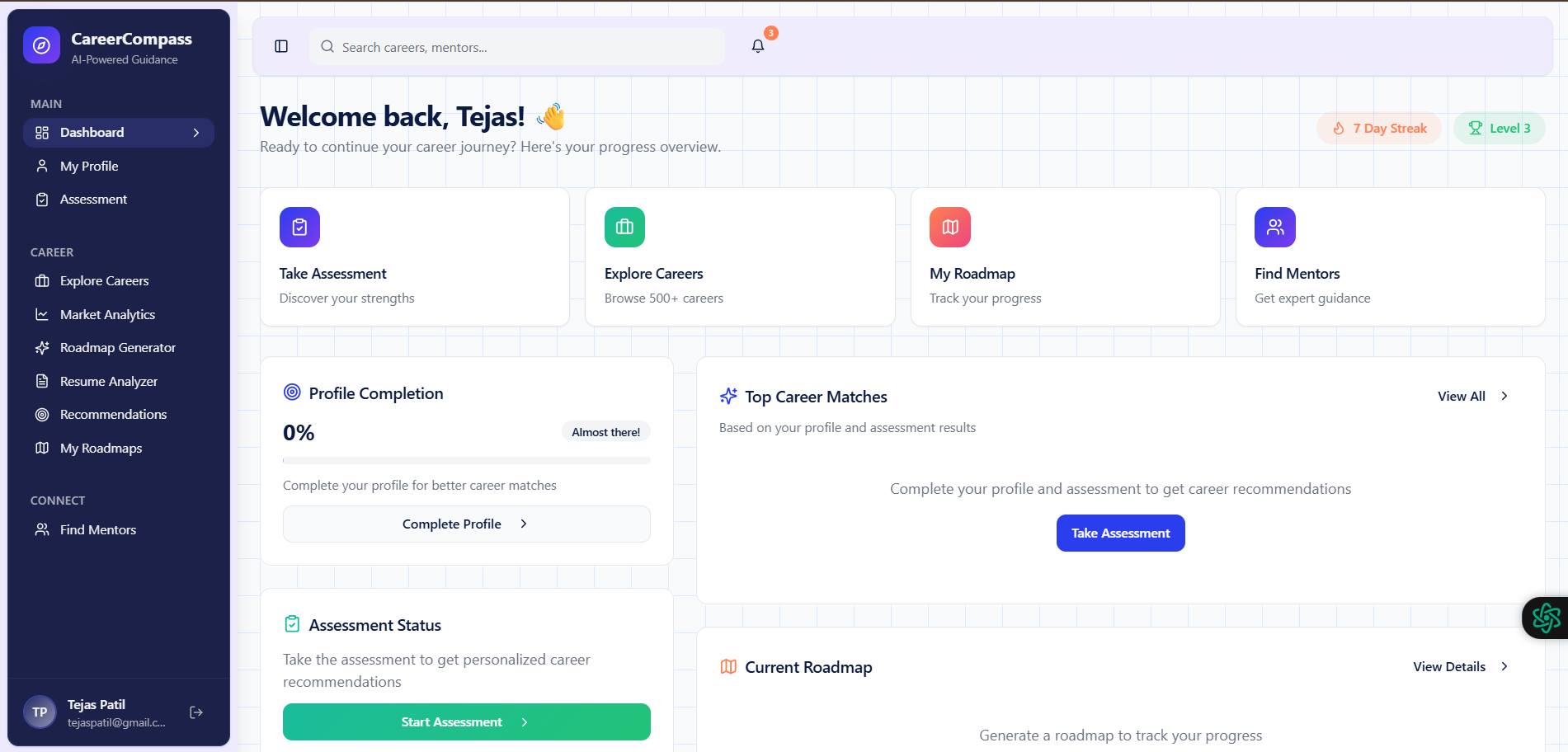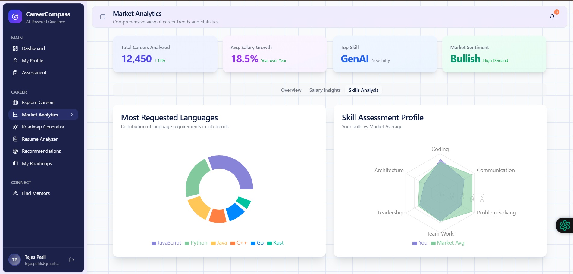 What it does CareerCompass is an intelligent career guidance platform that serves as a GPS for your professional journey.