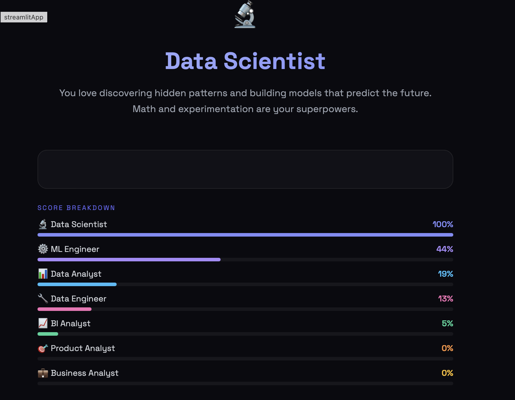 Built with Python and Streamlit. The scoring system uses weighted answers across 7 roles — Data Scientist, ML Engineer, Data Analyst, BI Analyst, Product Analyst, Business Analyst, and Data Engineer. Deployed on Streamlit Cloud via GitHub.