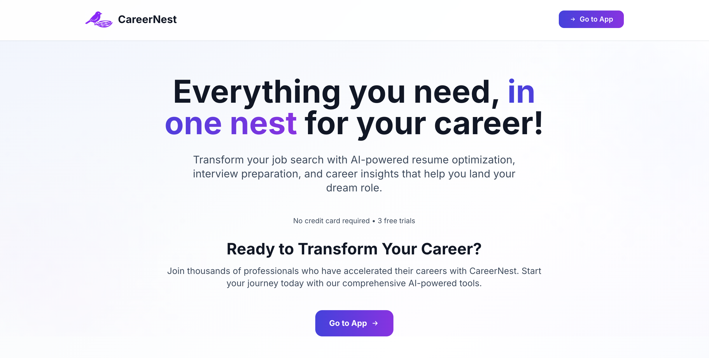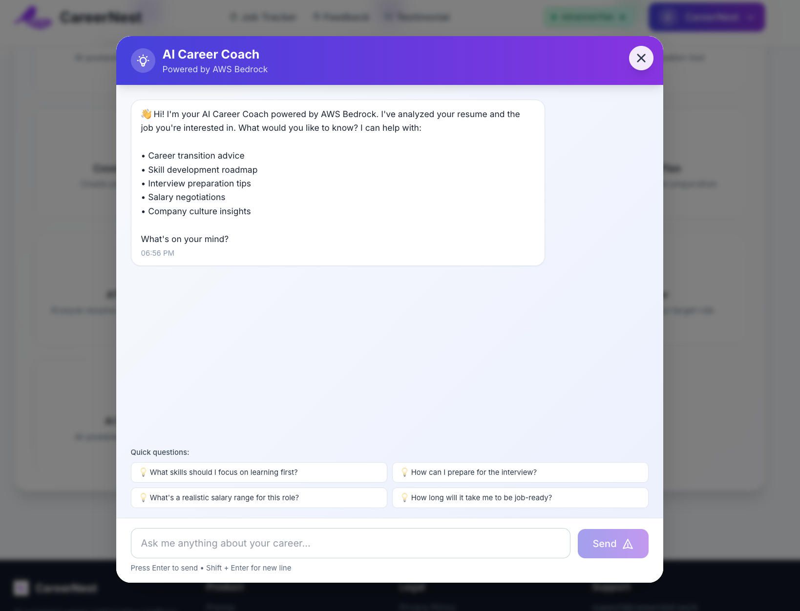 CareerNest is an AI-powered career optimization platform that helps users at every stage of their job search: 1) AI Career Coach (AWS Bedrock), Personalized, context-aware career conversations powered by Claude 3 Sonnet via AWS Bedrock. 2) Resume Optimizer - Upload your resume + job description → get instant improvement suggestions. 3) Behavioral & Technical Q&A Generator - Creates role-specific interview questions with answers. 4) Skill Gap Detection (AWS SageMaker) - ML pipeline predicts job match score, missing skills, salary estimate and time-to-job-ready. 5) ATS Score Analyzer - Tests how well your resume passes Applicant Tracking Systems. 6) Smart Project Recommender - Suggests mini-projects to strengthen weak areas in your resume.