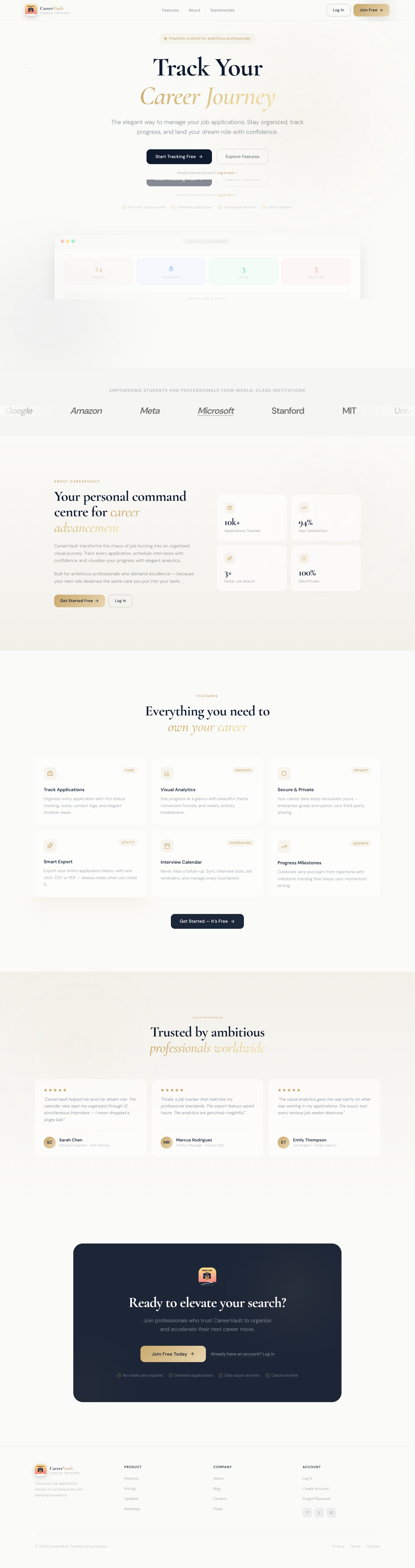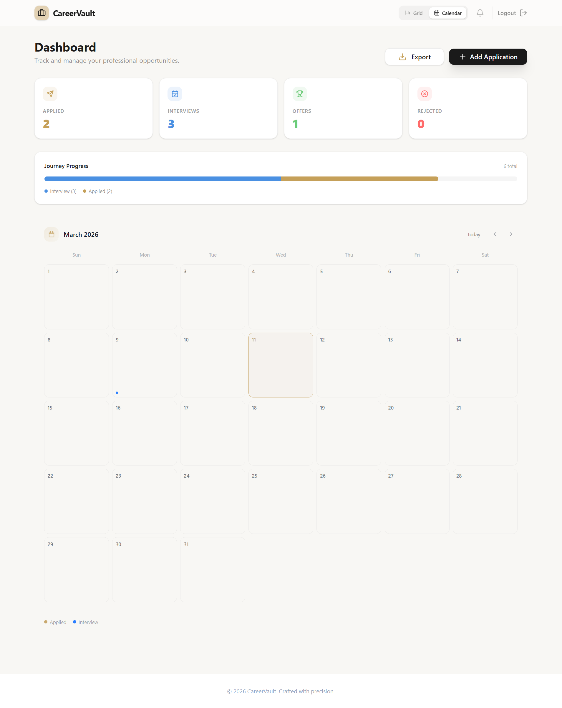 CareerVault was inspired by the often overwhelming and disorganized process of job searching. I noticed how tracking multiple applications, remembering interview schedules, and preparing effectively can quickly become stressful, so I set out to create a tool specifically for job seekers that combines organization, progress tracking, and AI-powered guidance in one platform. Built with React, TypeScript, Vite, and Tailwind CSS, the frontend provides a responsive dashboard that works seamlessly on desktop and mobile, while Firebase handles authentication and real-time data storage. Users can track application statuses (Applied, Interview, Hired, Rejected), schedule interviews via a calendar, visualize progress through charts and analytics, export application history, and receive AI-powered interview preparation suggestions using the OpenAI API. Developing CareerVault taught me valuable lessons in full-stack development, real-time state management, AI integration, and responsive design. Challenges included keeping the React state synchronized with Firestore updates, designing a clean and intuitive dashboard, handling API requests for AI suggestions, and exporting structured data efficiently. Overall, CareerVault is more than just a tracking tool—it’s a personal assistant that empowers job seekers to stay organized, prepare confidently, and maximize their chances of landing their next opportunity.