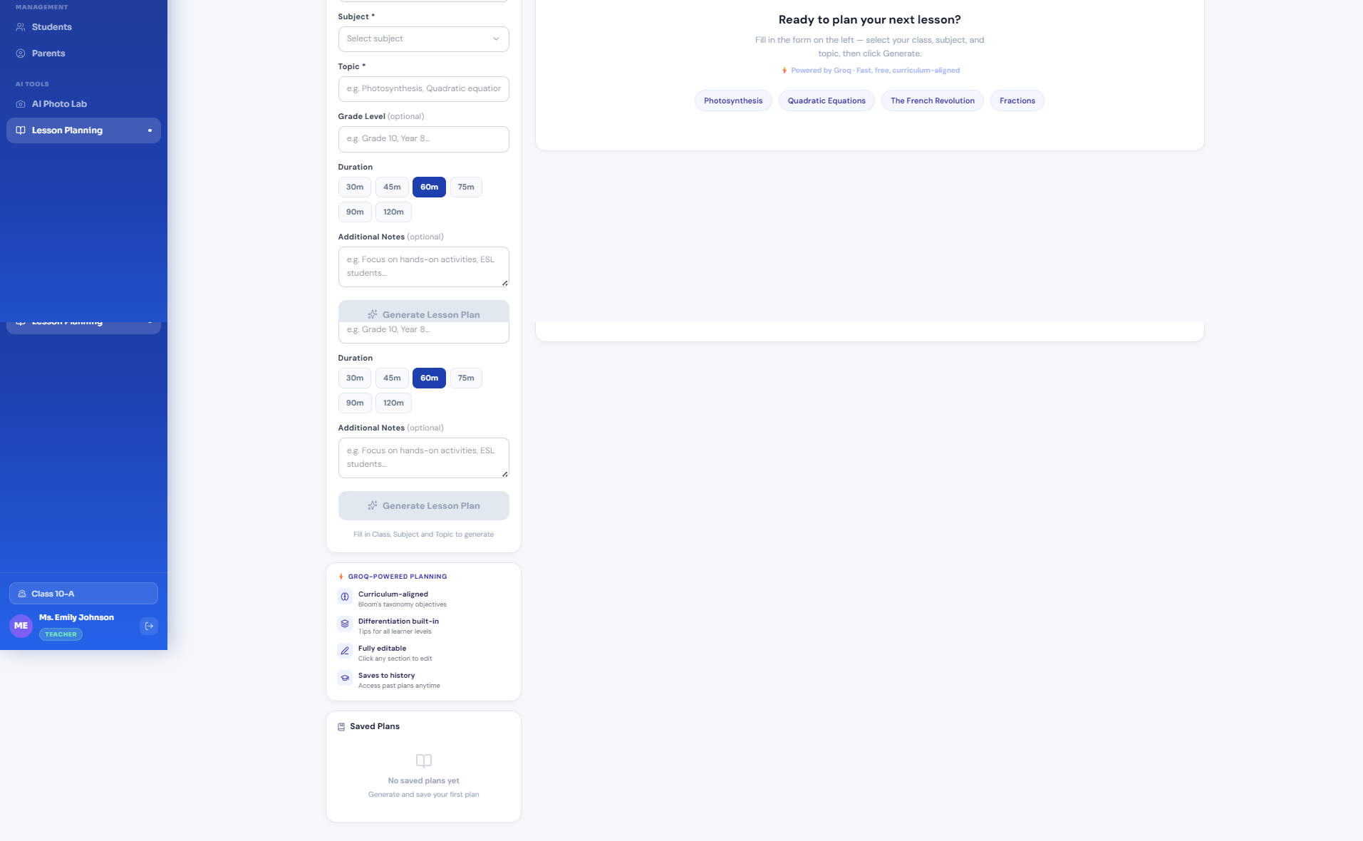 - AI lesson planning — Groq generates full, curriculum-aligned lesson plans from a subject + topic in seconds