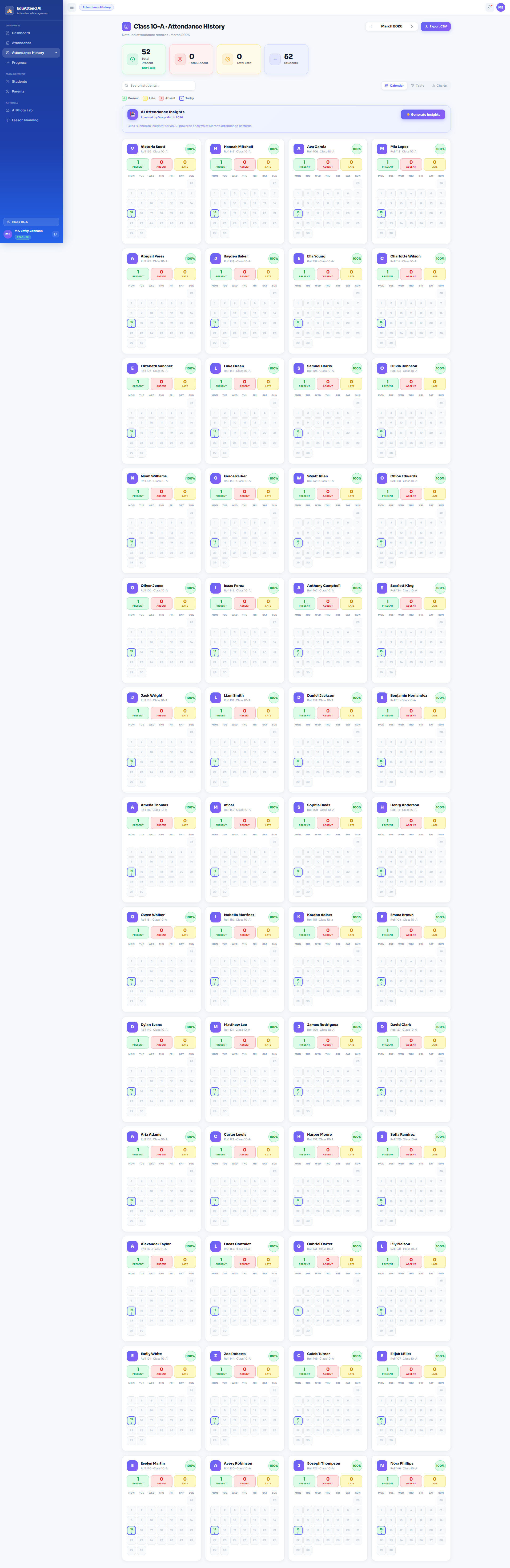 - Real-time attendance marking — teachers mark via grid or list view from any device
