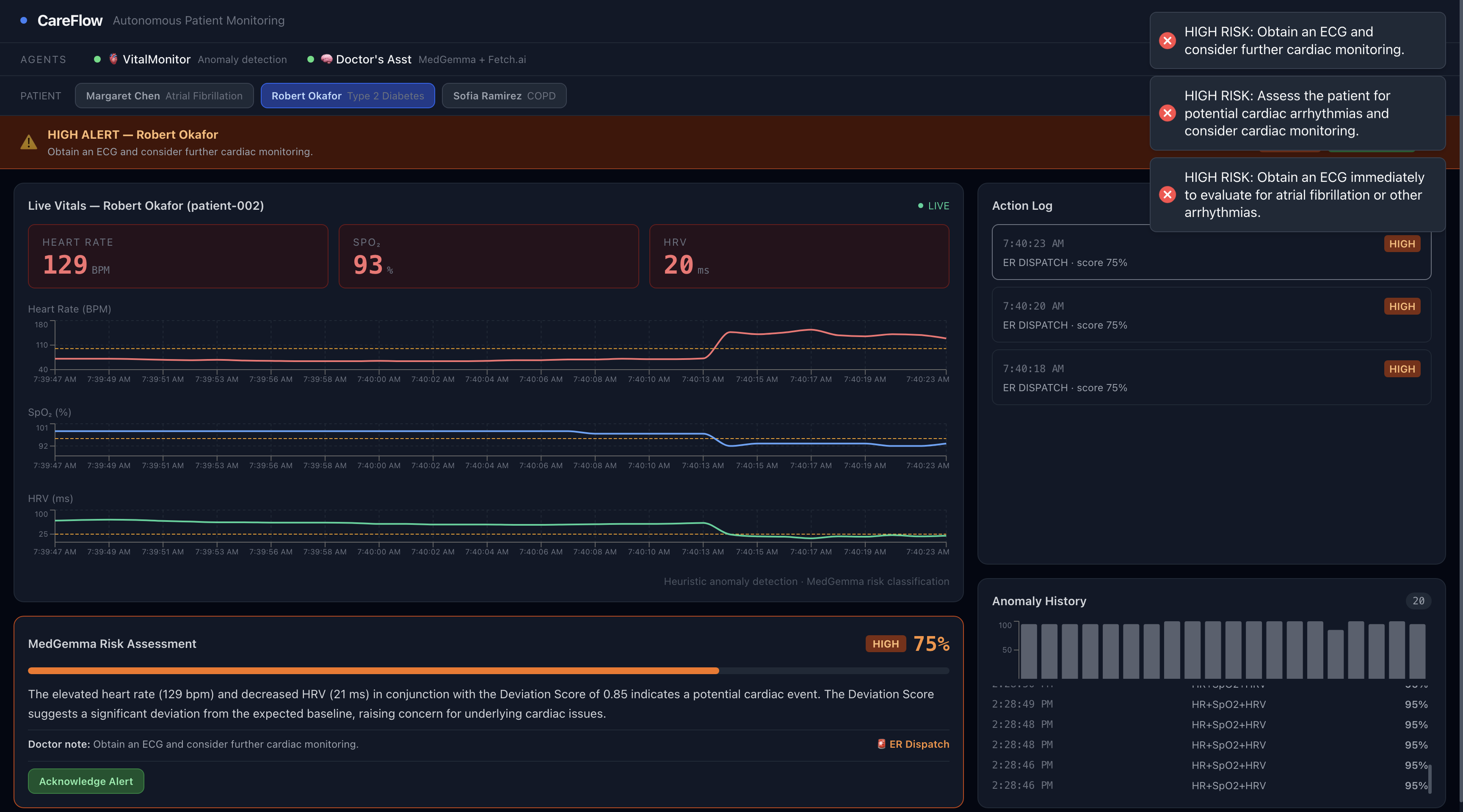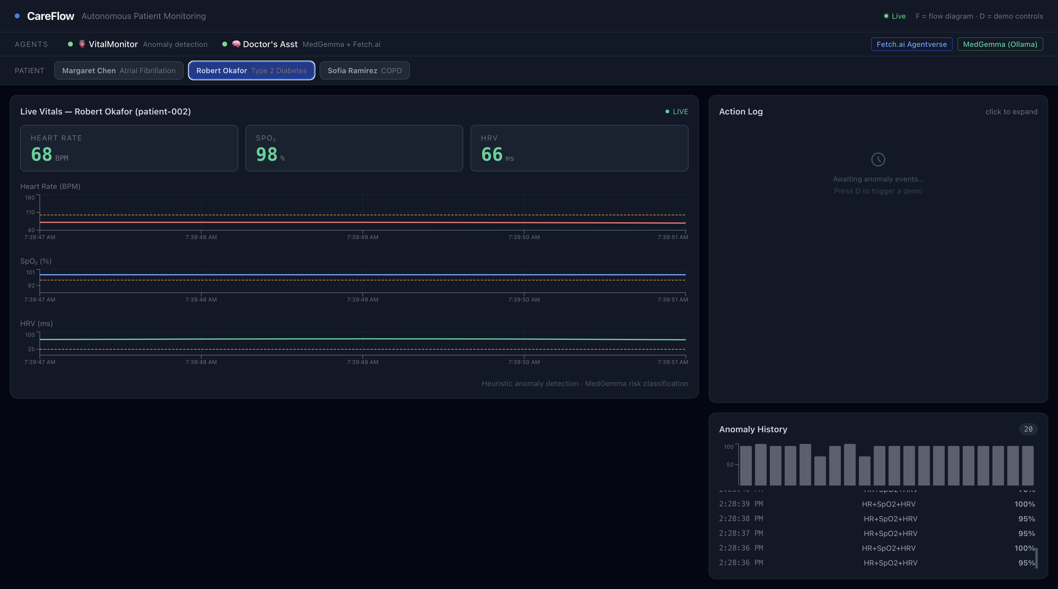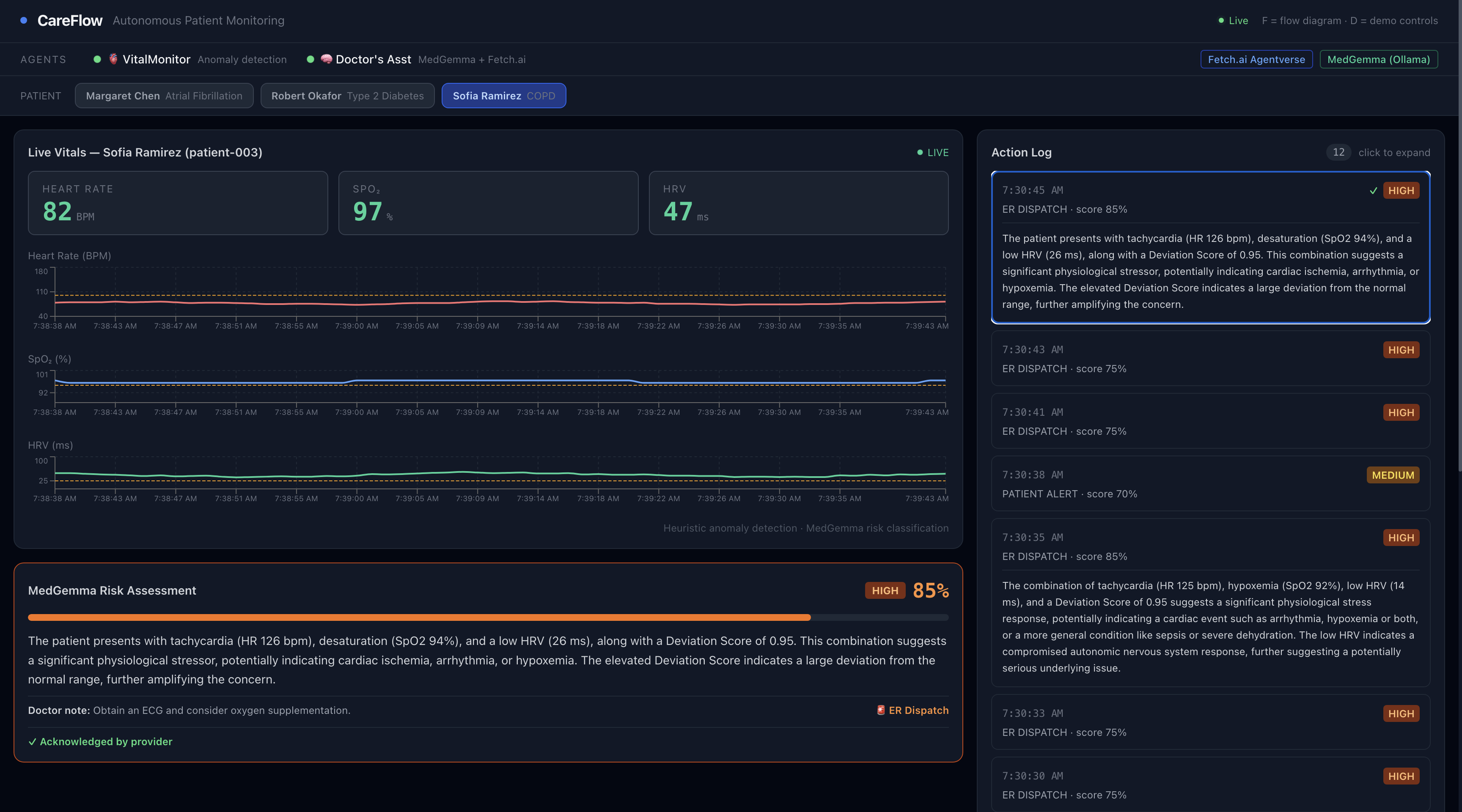 Hospitals are full of alerts, but many aren’t actionable. Clinicians spend time filtering noise, while real risks can slip through. In critical moments, that delay can mean the difference between early intervention and emergency. At the same time, hospitals already collect continuous patient data, but data alone doesn’t create action. Providers still have to notice, interpret, decide, and communicate. CareFlow was built to close that gap: turning raw vitals into immediate, safe, and actionable responses.